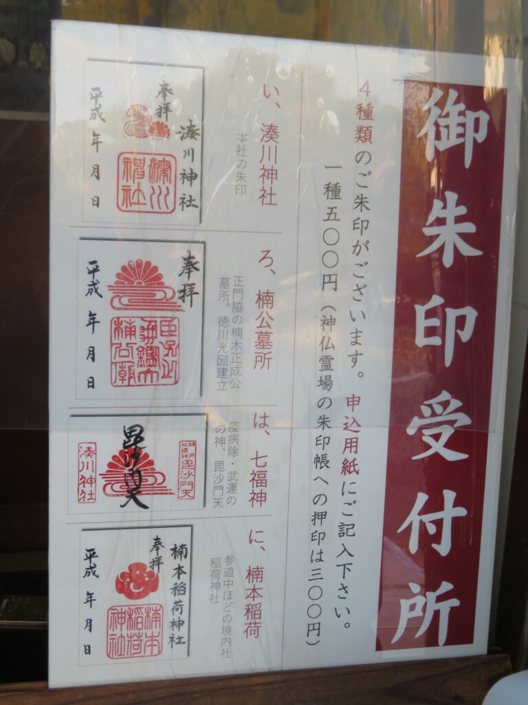 神戸市中央区の湊川神社では、4種類の御朱印を頂くことができます。神社の境内はご祭神の楠木正成の戦没地でもあるので、楠公に因む御朱印には鎌倉時代末期の歴史観が溢れているようです。