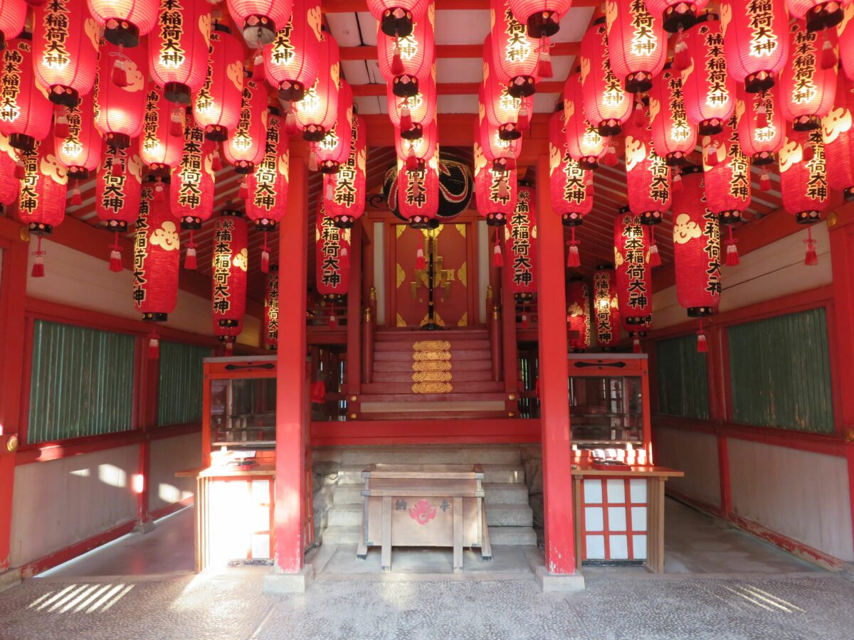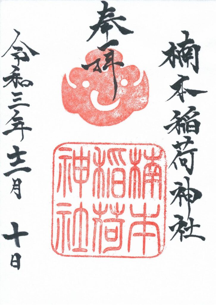湊川神社の創建は1872年ですが、江戸時代にはこの地に楠本稲荷神社が社殿を構えていました。楠公御墓所の北に建立される楠本稲荷神社の御朱印には、火焔宝珠文様が押印されます。祈れば何でも望むものが出せるという「如意宝珠」の上部と左右に炎が燃え上がります。