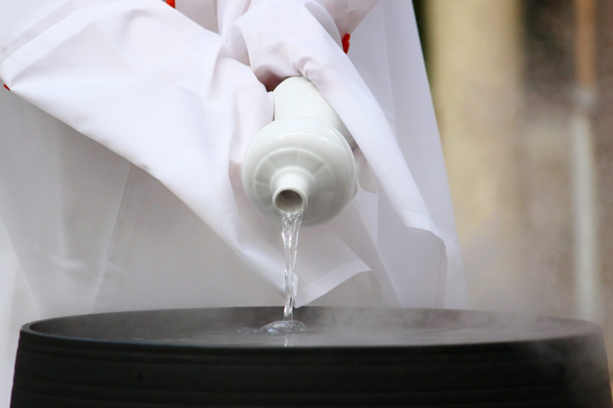 できあがったお湯は楠本稲荷神社へと奉納されます。巫女さんが筒へと柄杓でお湯を移していきます。