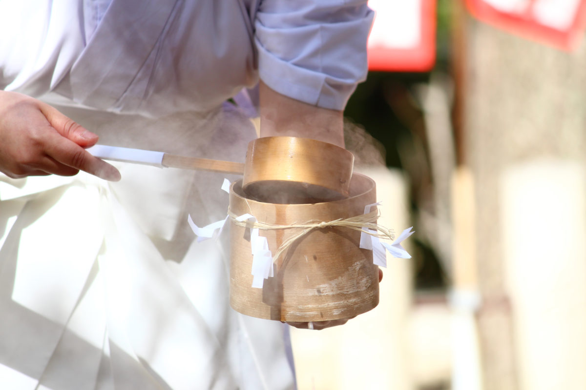 お湯を神社に奉納して終わりかと言うと、まだまだここからが本番です!湯立神事のメイン「湯立」がはじまります!