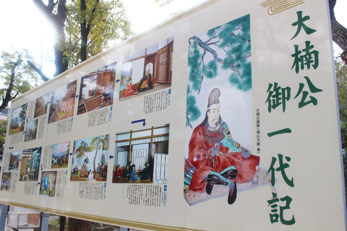 境内には大楠公(だいなんこう)と呼ばれ親しまれている楠木正成の一生を描いた説明もあります。ぜひご覧ください!
