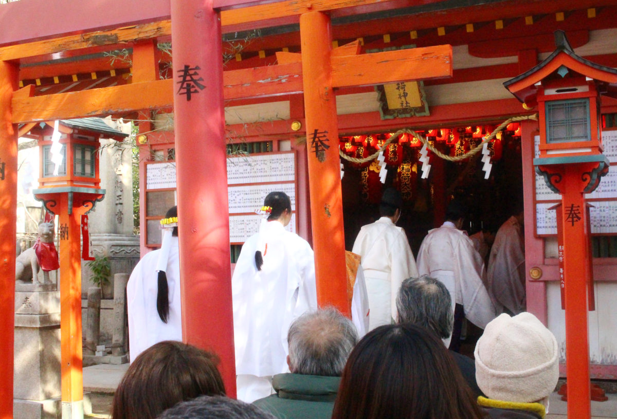 11時を迎え、初午祭がはじまります!神主さんや巫女さんが社殿へとやってきました!