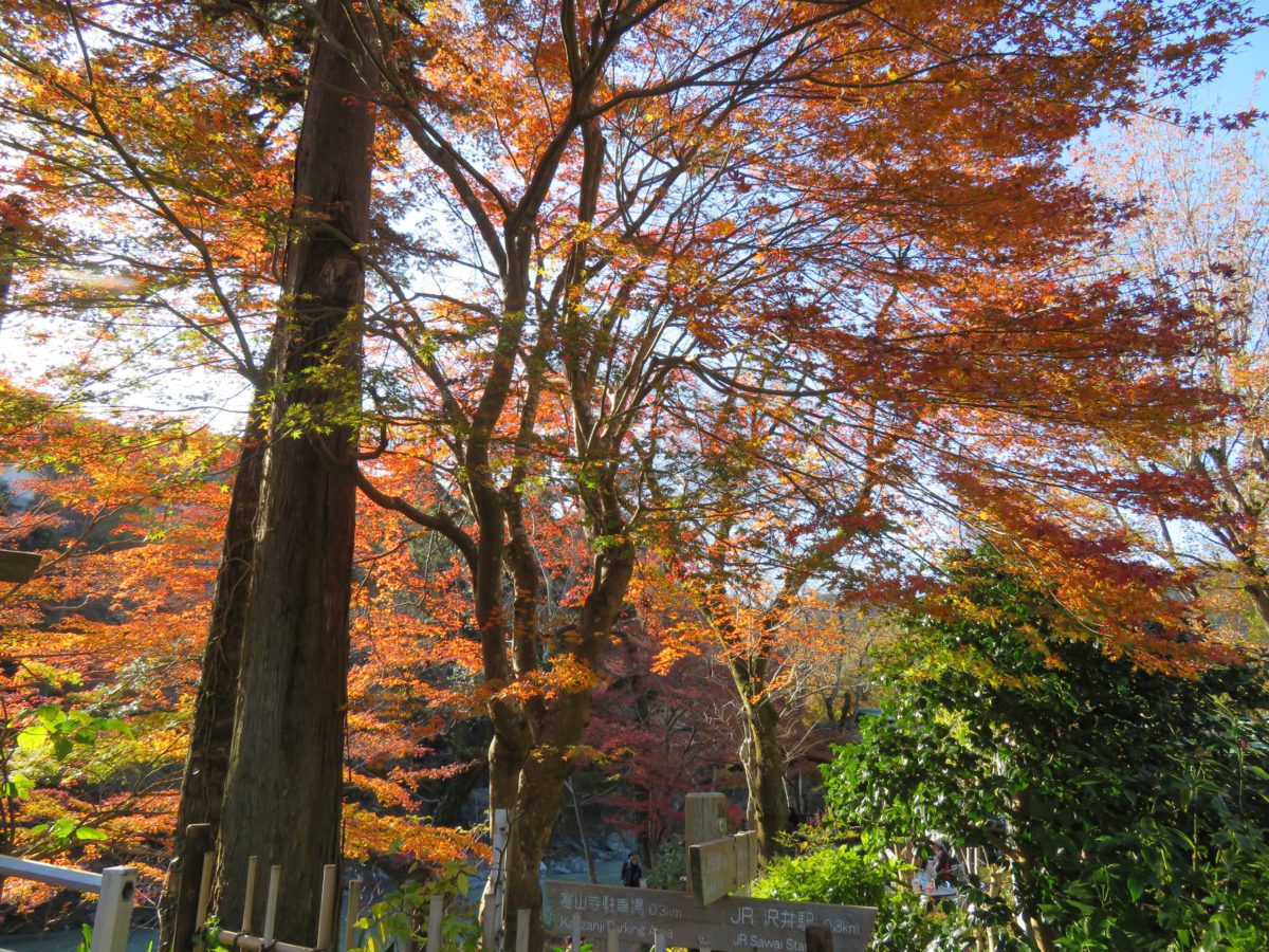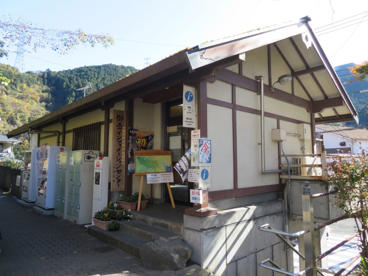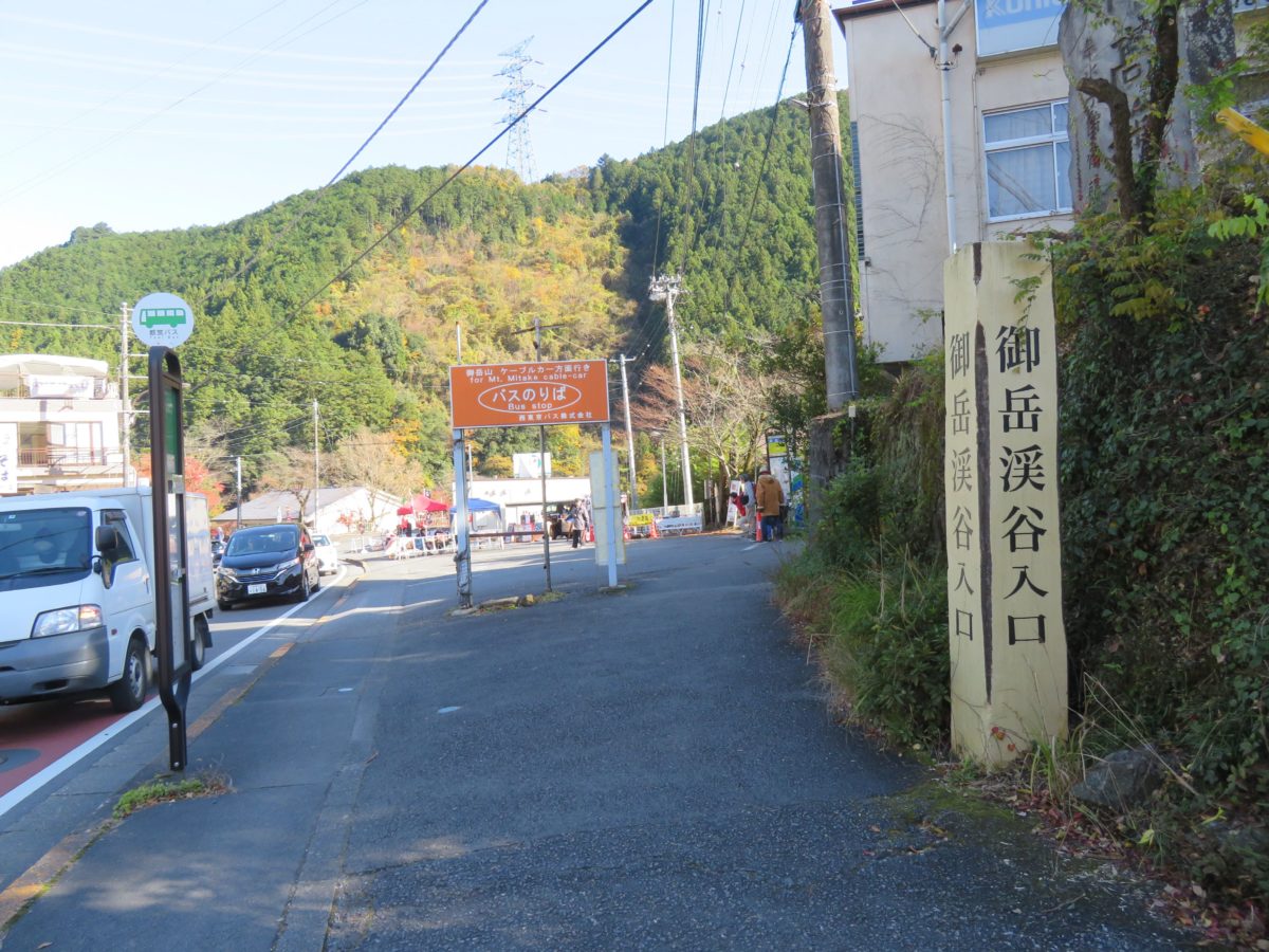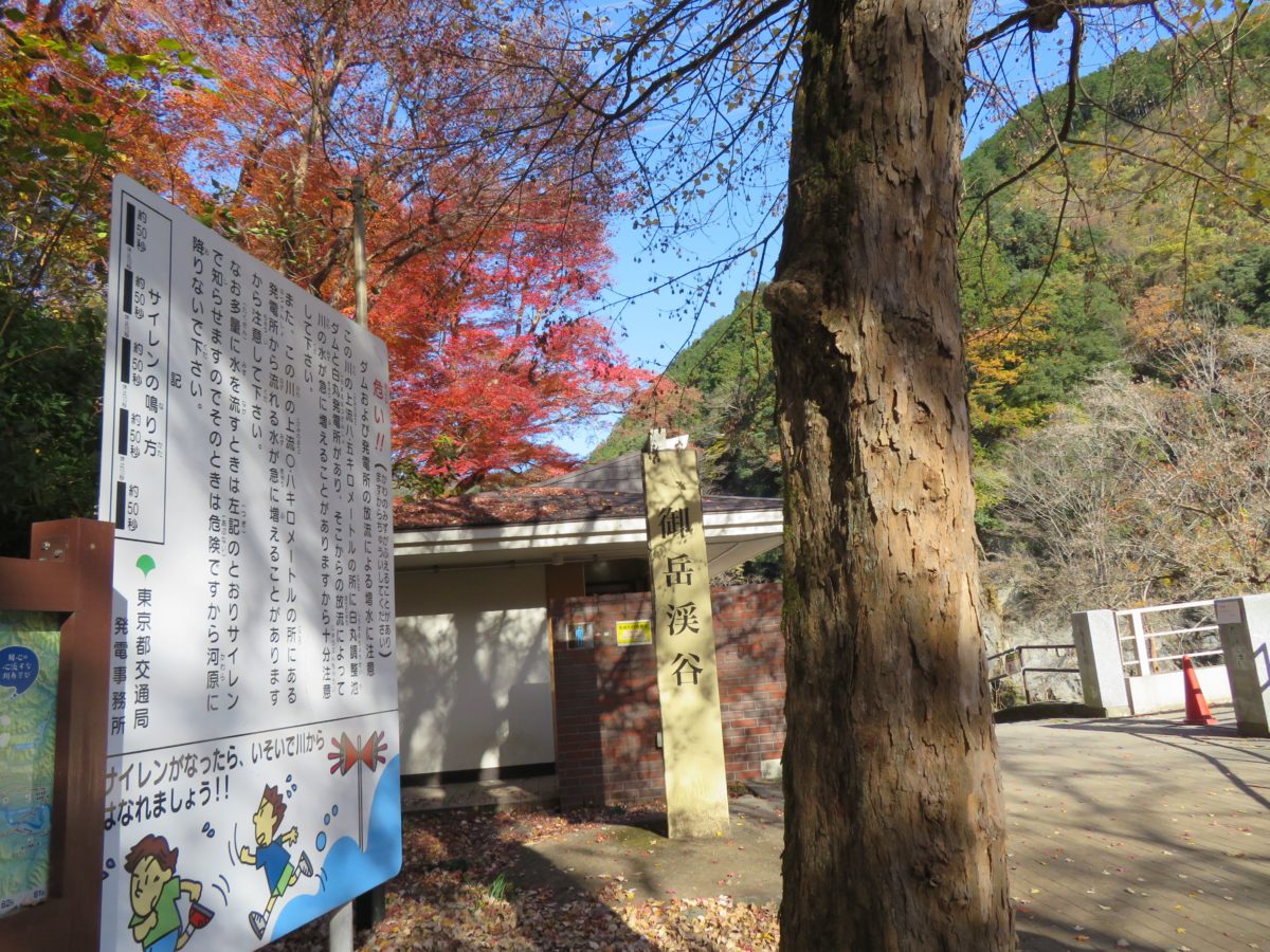 御岳渓谷ハイキングの起点となるのはJR御嶽駅です。紅葉シーズンになると電車が御嶽駅に着く度に大勢の人々が下車してきます。駅舎を出てすぐ左の御岳インフォメーションセンターにはマップが準備されているので、これが紅葉狩りの道しるべとなります。御嶽駅の正面で多摩川に架かる御岳橋から下流に向かって川沿いに遊歩道が整備されています。御嶽駅のバス乗場から遊歩道に入ることができます。バス乗場の東に建つ御岳交流センターからは御岳小橋を彩る紅葉を一望することができます。