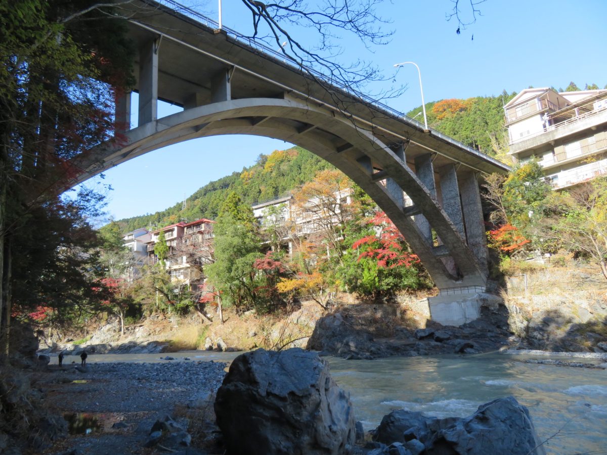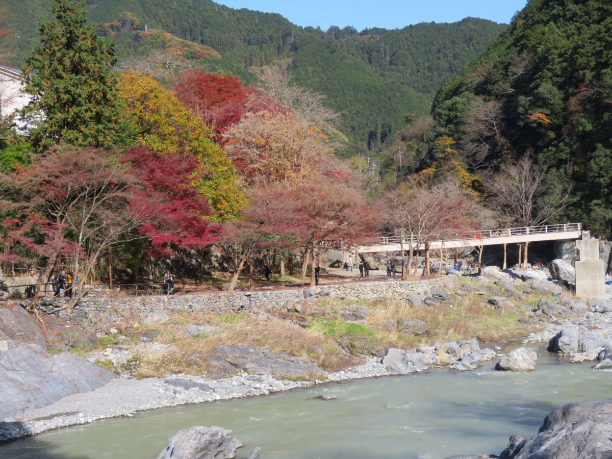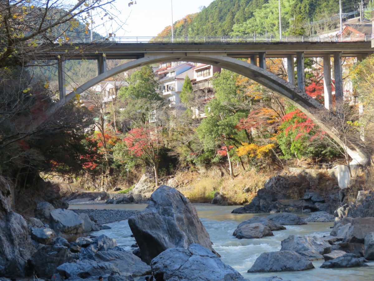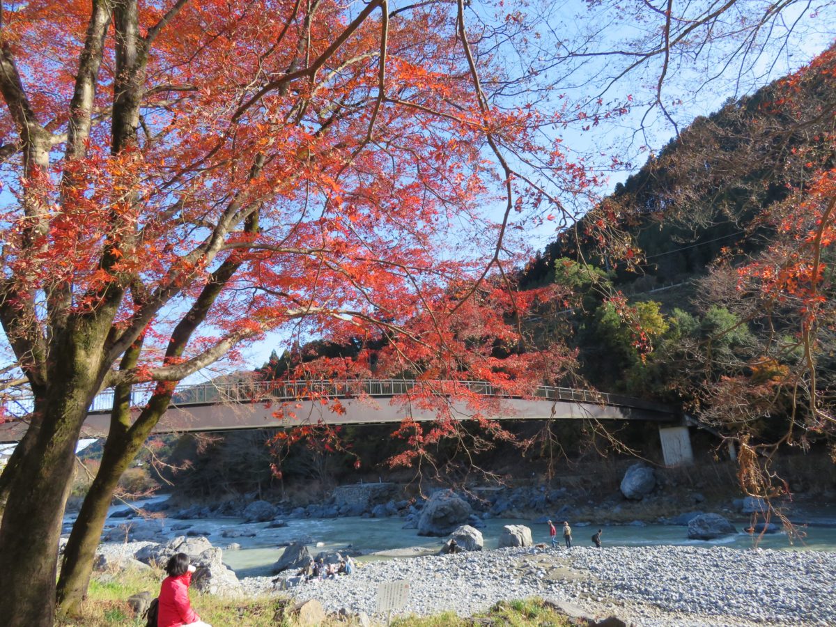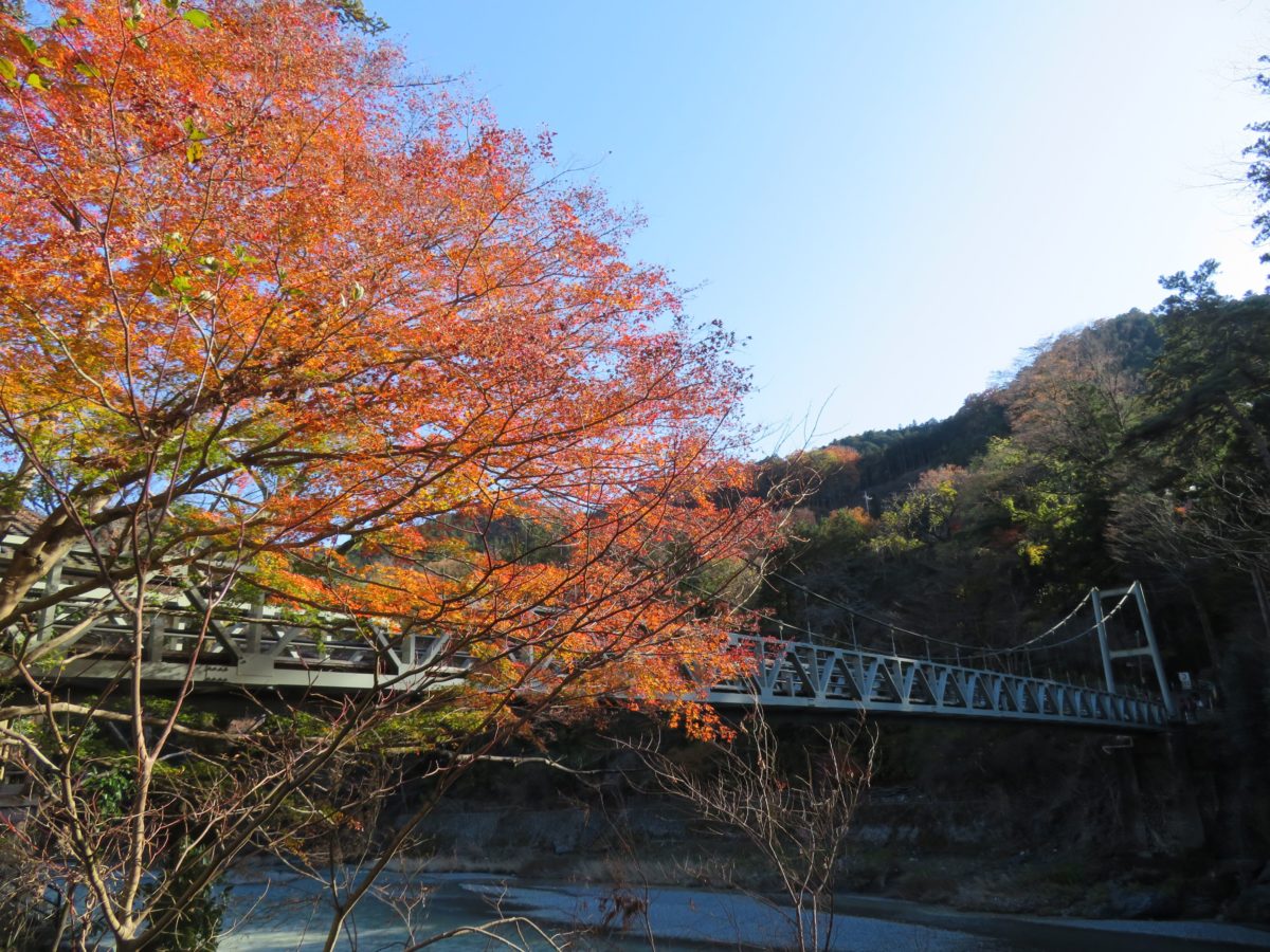 御岳小橋の袂から多摩川に沿って遊歩道を下ります。岩の間を滑るように流れる川の水を追うかのようです。御岳小橋から数百メートルのところに鵜の瀬橋が架かっています。橋の袂は紅葉で染められ、河原に設けられたあずまやは格好の紅葉狩りスポットとなっています。橋の下ではバーベキューをしている人を見かけることもあります。