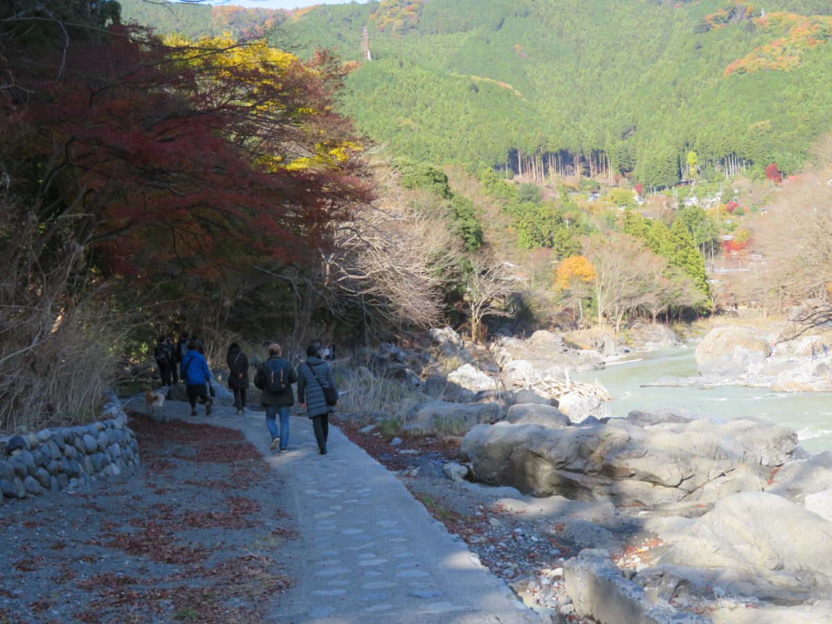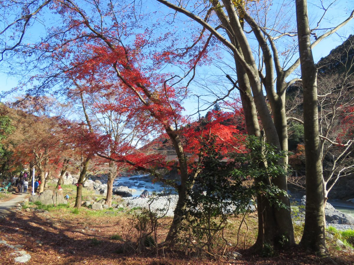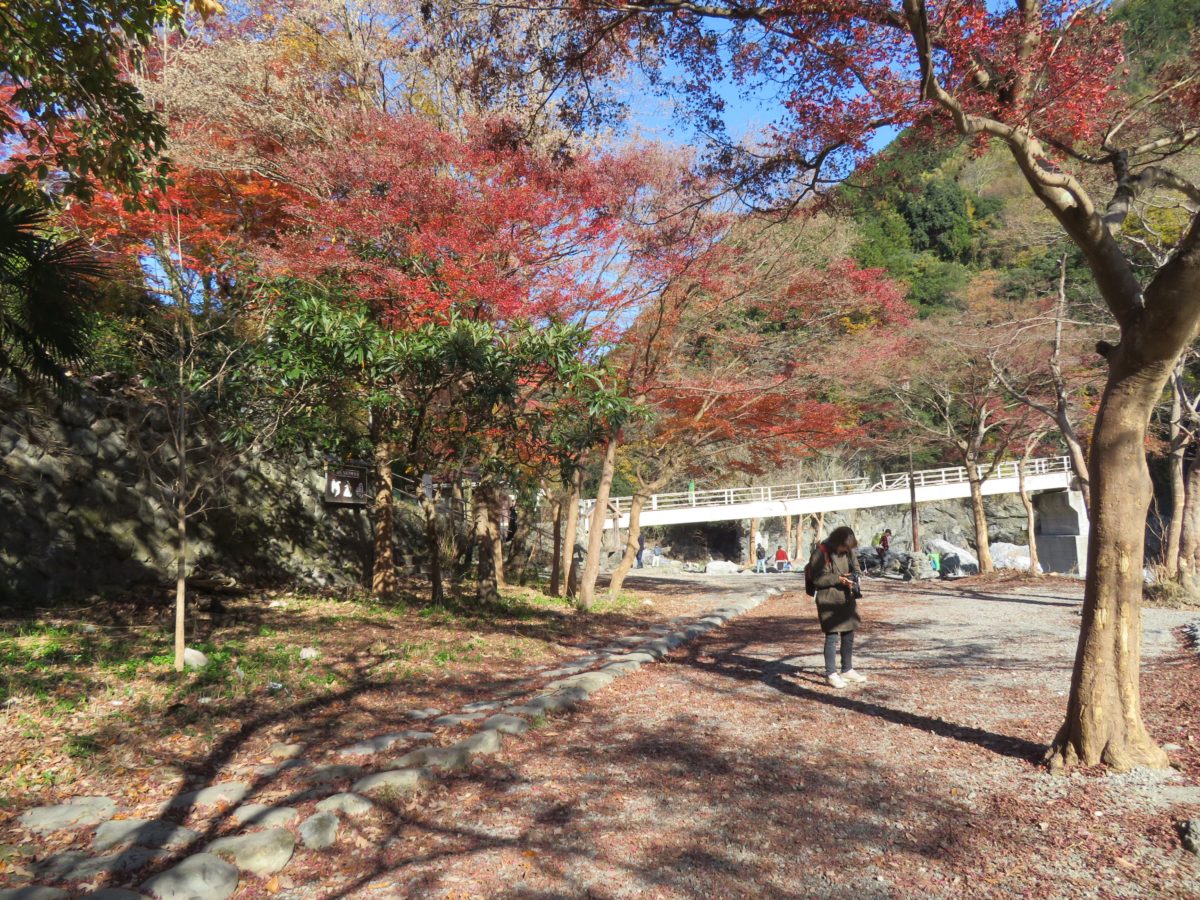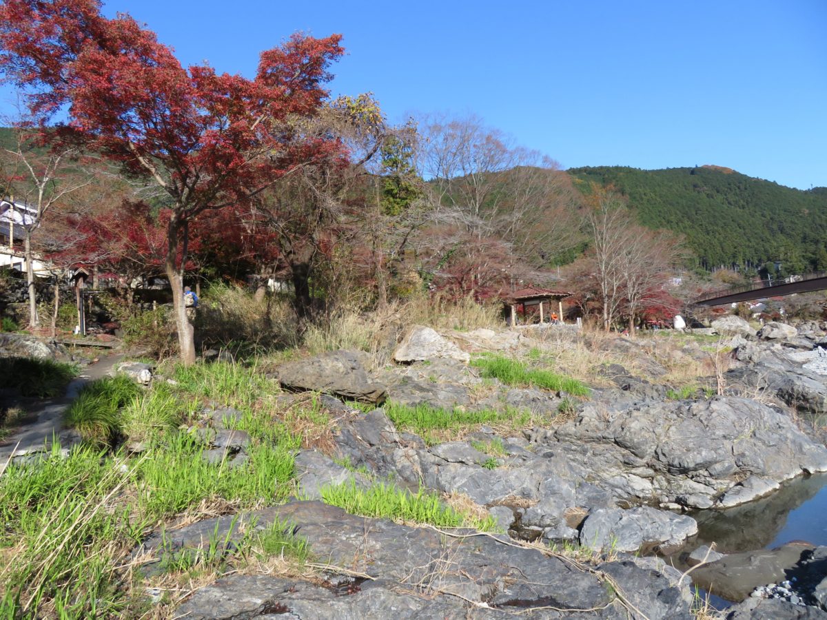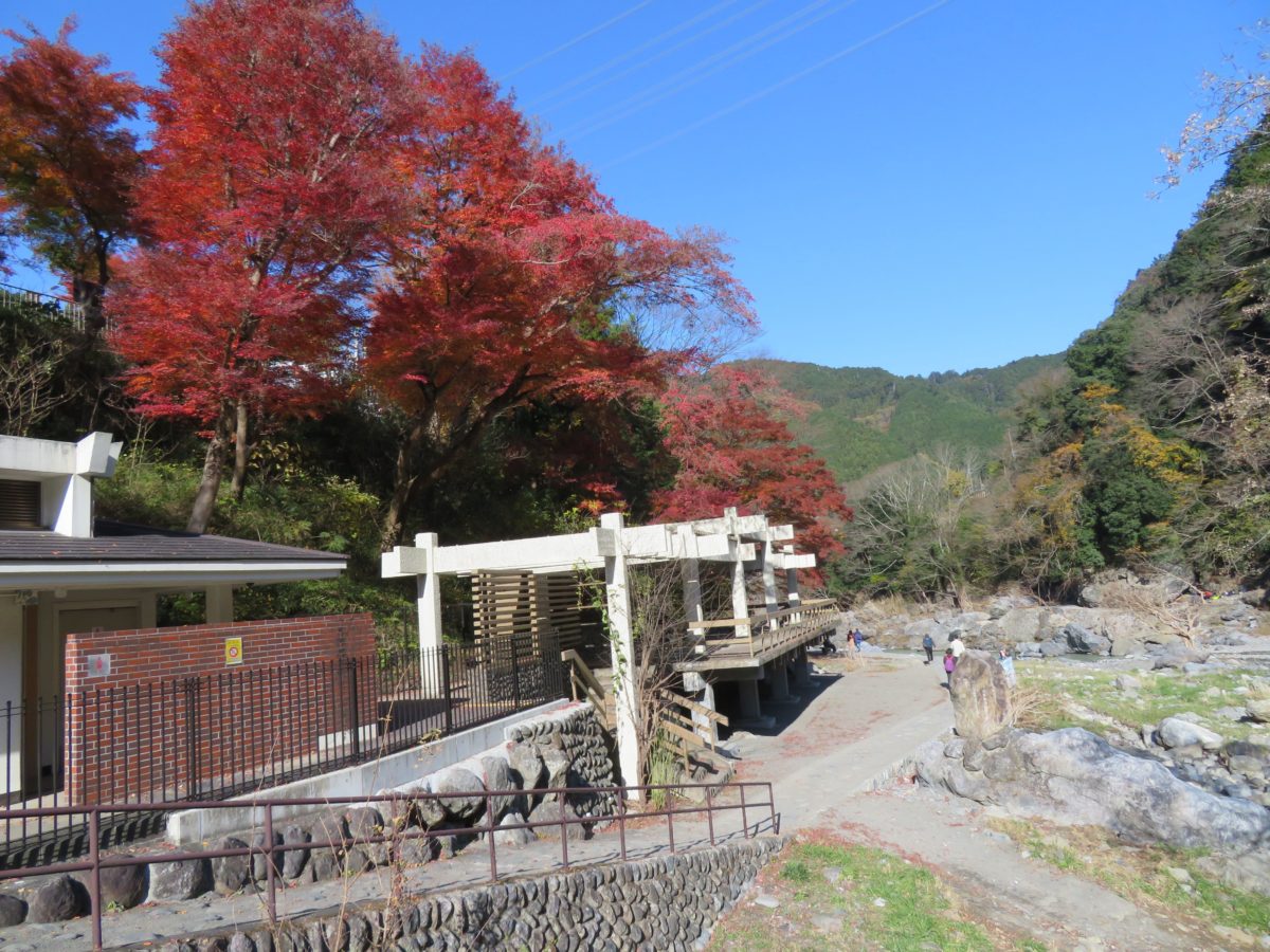 御岳小橋の袂から多摩川に沿って遊歩道を下ります。岩の間を滑るように流れる川の水を追うかのようです。御岳小橋から数百メートルのところに鵜の瀬橋が架かっています。橋の袂は紅葉で染められ、河原に設けられたあずまやは格好の紅葉狩りスポットとなっています。橋の下ではバーベキューをしている人を見かけることもあります。