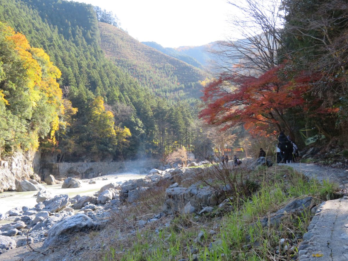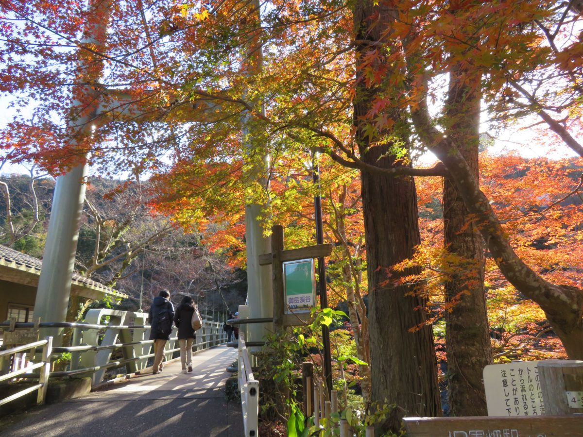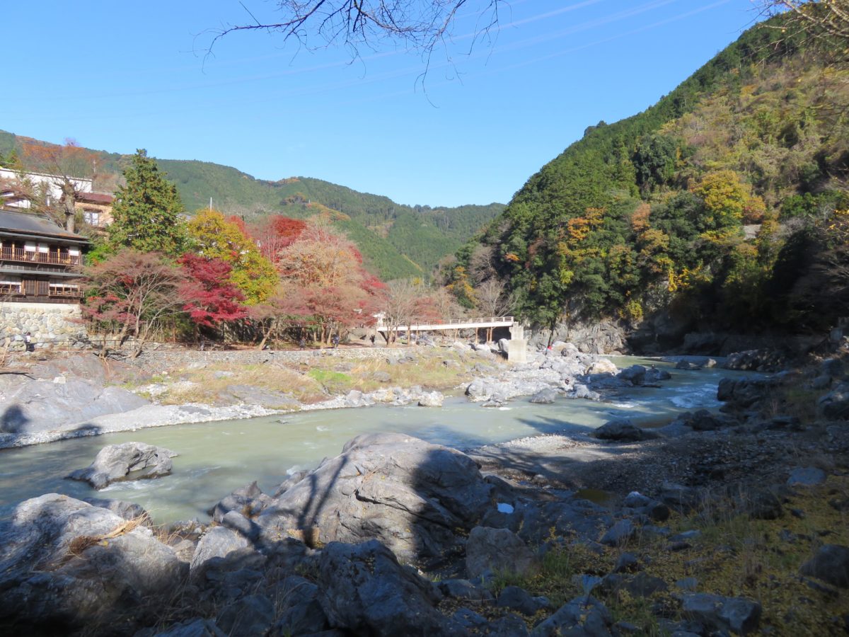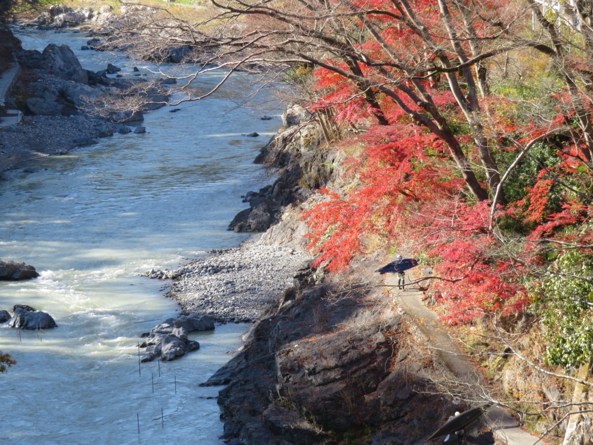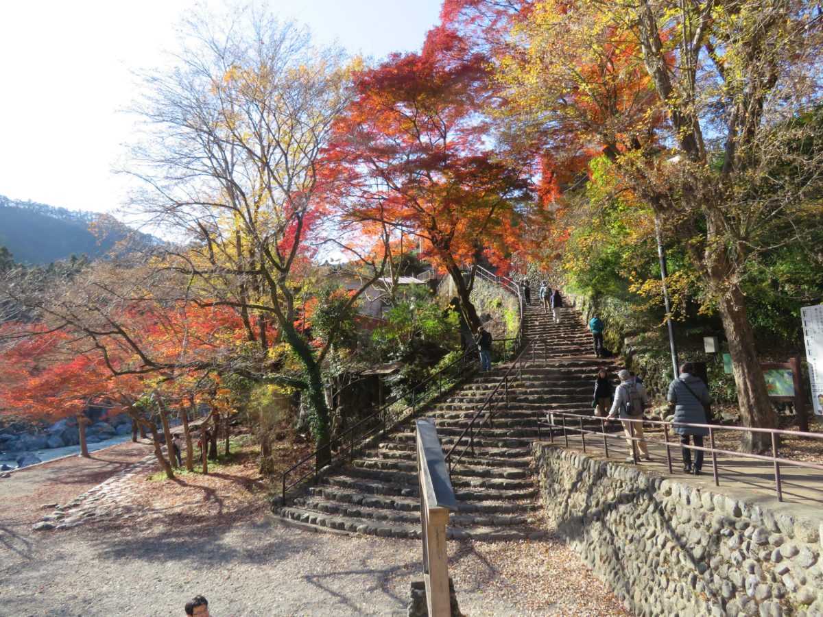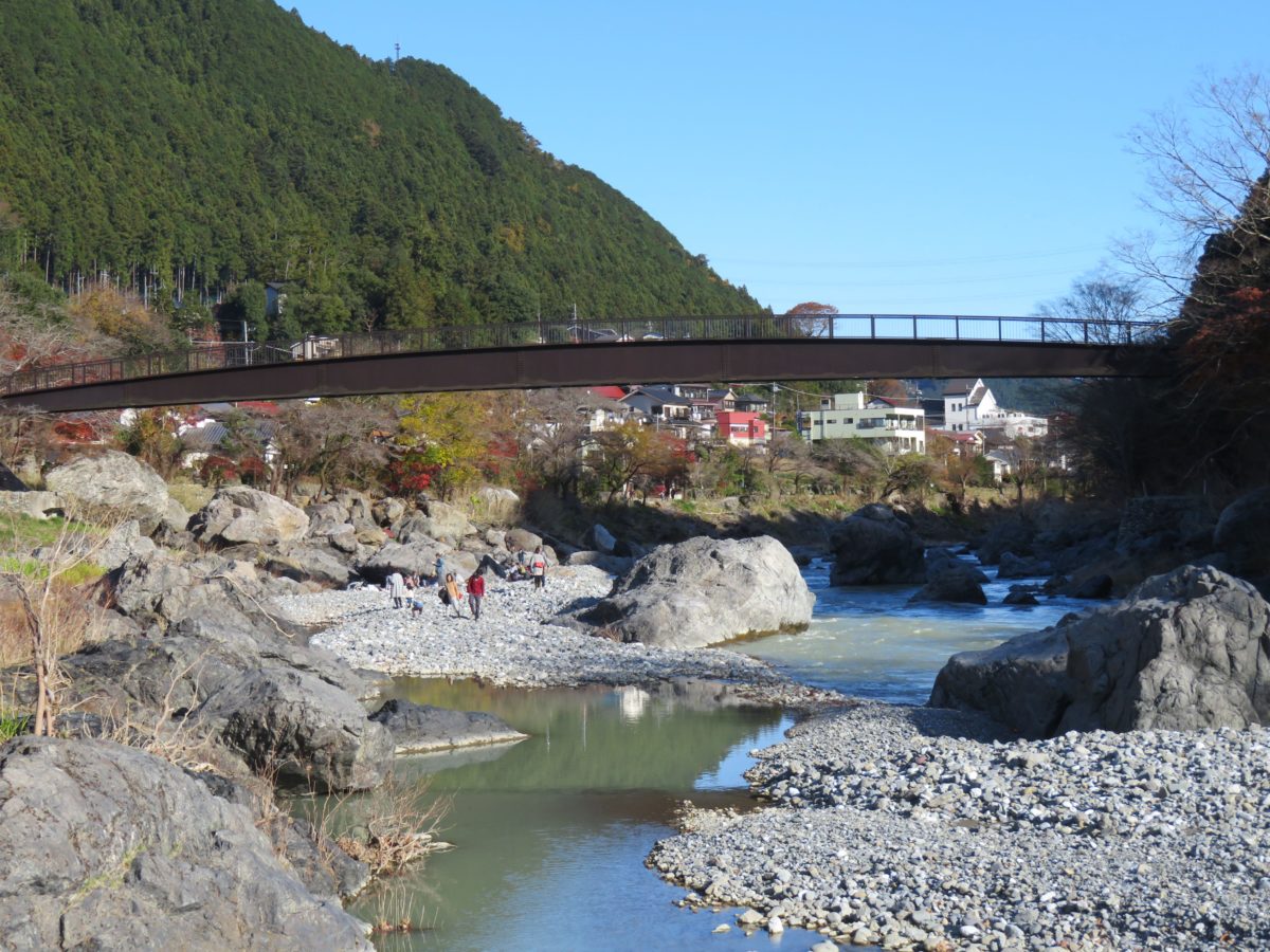 御岳小橋の袂から多摩川に沿って遊歩道を下ります。岩の間を滑るように流れる川の水を追うかのようです。御岳小橋から数百メートルのところに鵜の瀬橋が架かっています。橋の袂は紅葉で染められ、河原に設けられたあずまやは格好の紅葉狩りスポットとなっています。橋の下ではバーベキューをしている人を見かけることもあります。