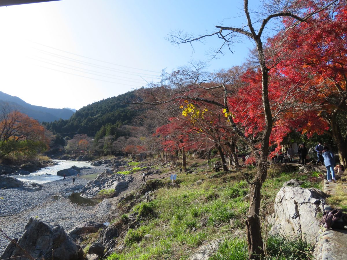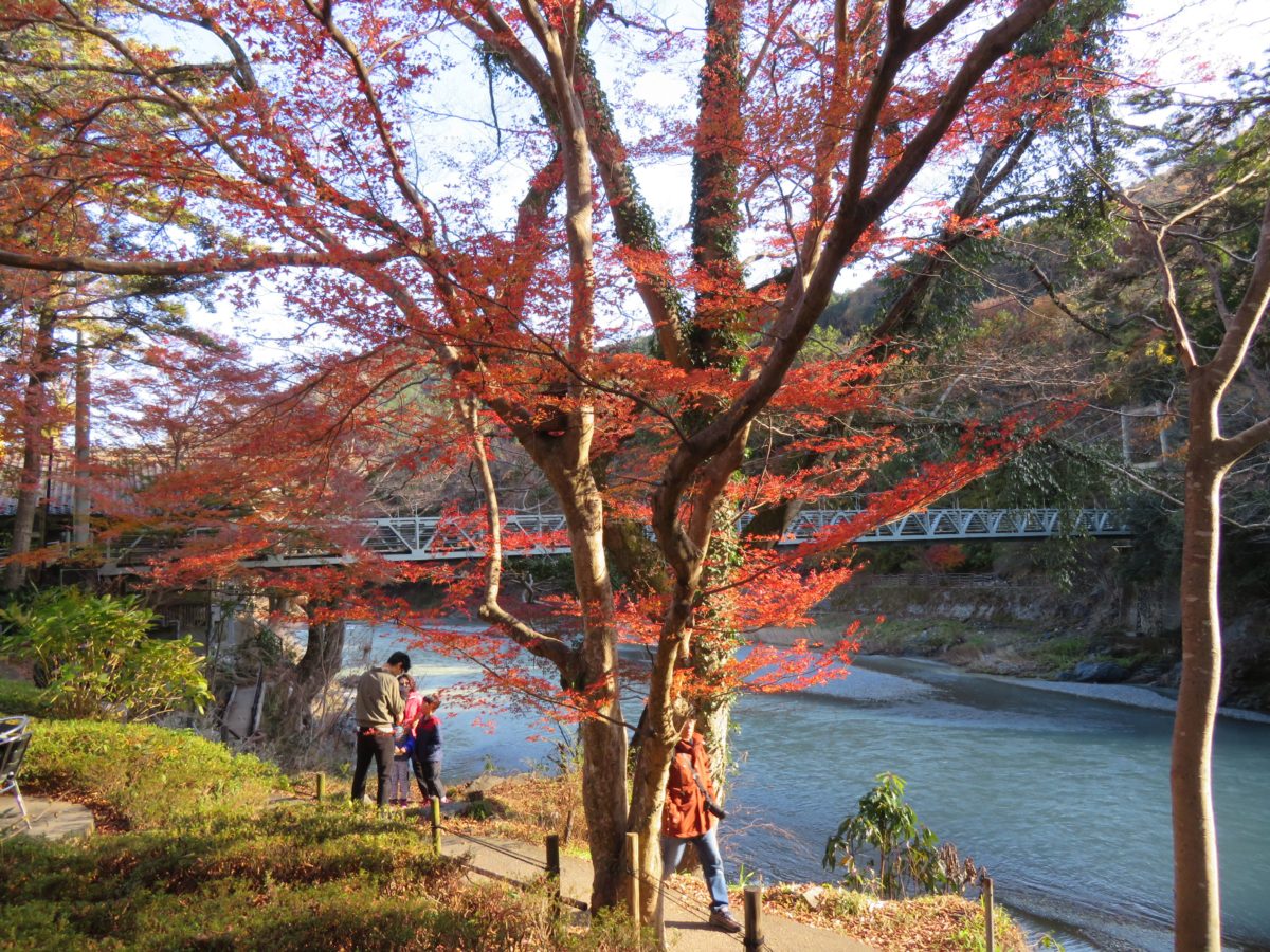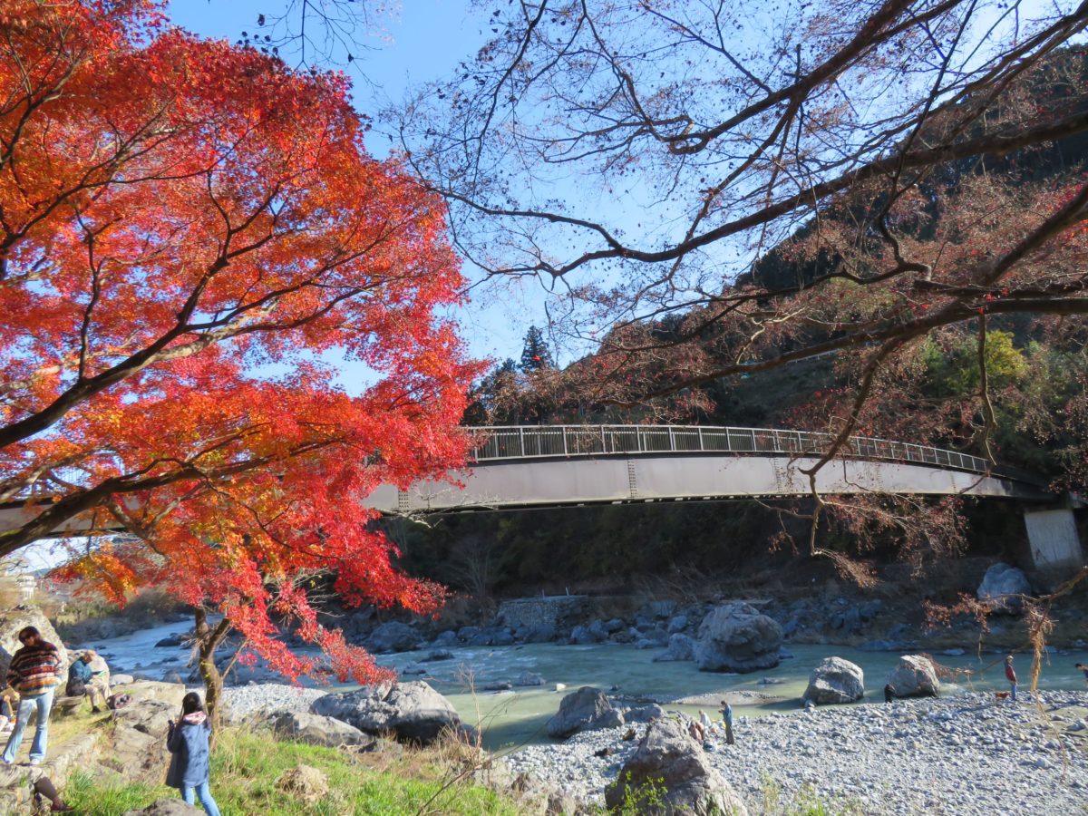 鵜の瀬橋から遊歩道さらに数百メートル下流に向かうと楓橋です。楓橋はJR沢井駅に近く、御嶽駅から1駅、1キロあまりのハイキングとなります。楓橋の河川敷は紅葉で埋め尽くされ、澤乃井園の清流ガーデンで澤乃井の名酒や軽食を味わいながら紅葉を鑑賞することができます。
