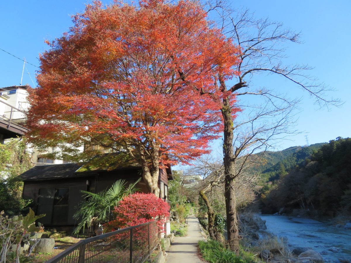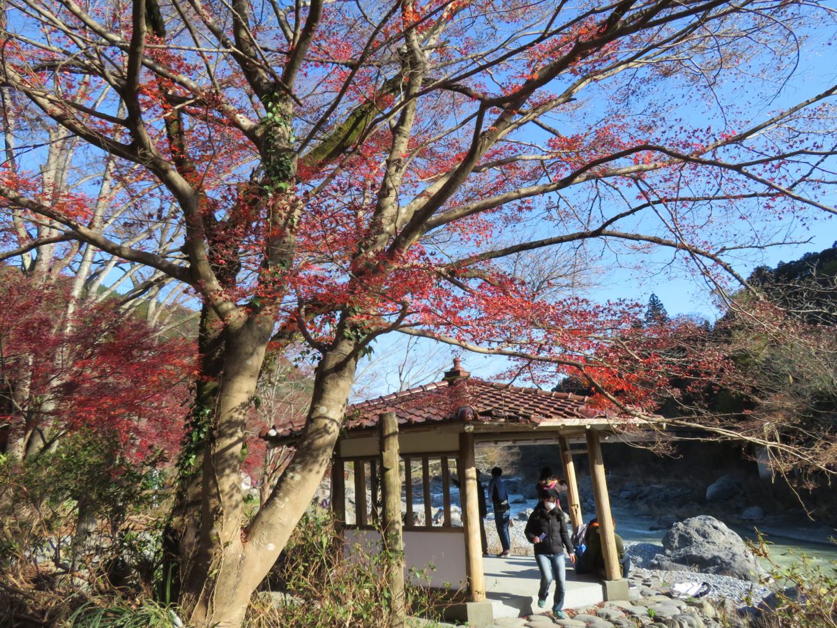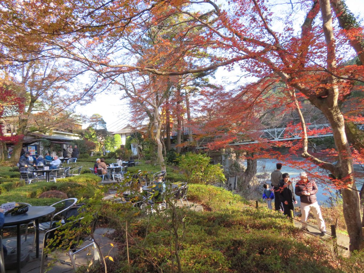 鵜の瀬橋から遊歩道さらに数百メートル下流に向かうと楓橋です。楓橋はJR沢井駅に近く、御嶽駅から1駅、1キロあまりのハイキングとなります。楓橋の河川敷は紅葉で埋め尽くされ、澤乃井園の清流ガーデンで澤乃井の名酒や軽食を味わいながら紅葉を鑑賞することができます。