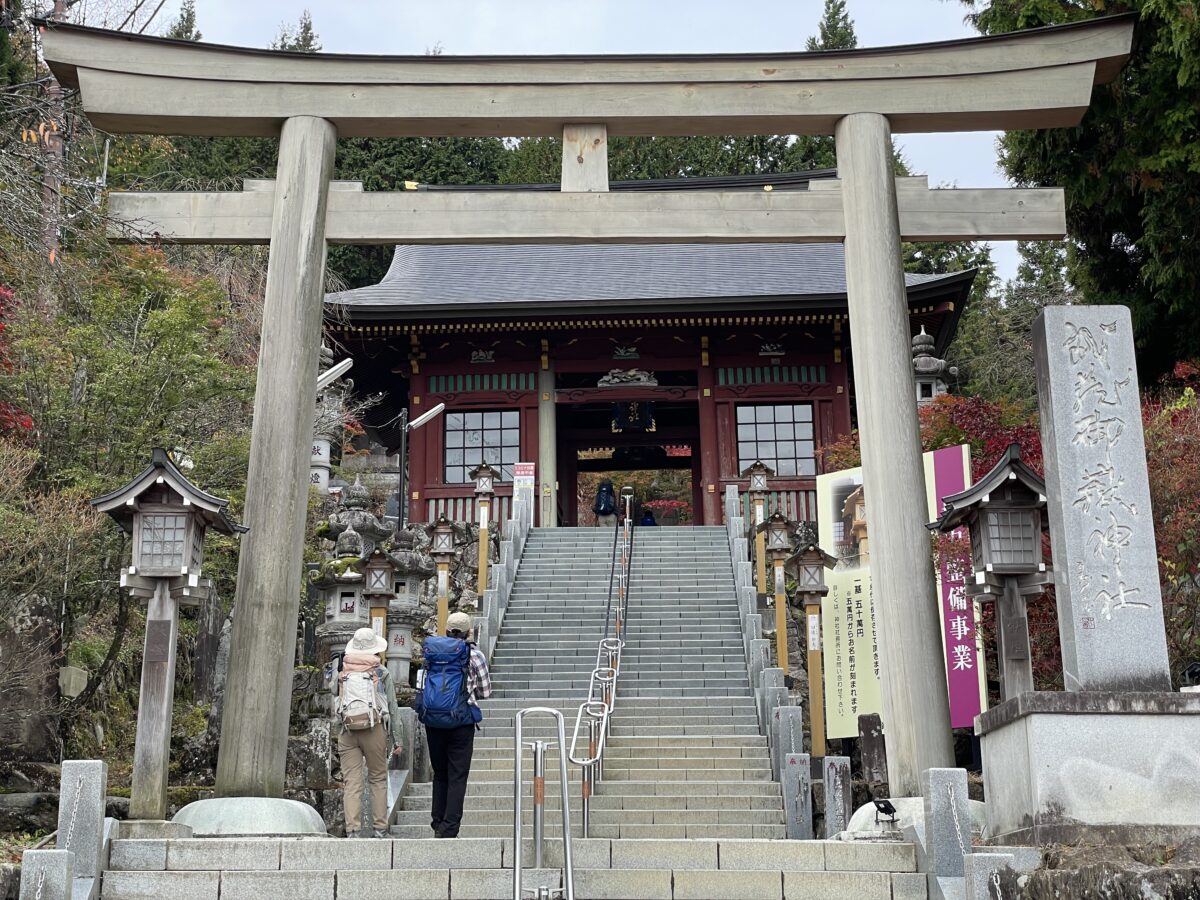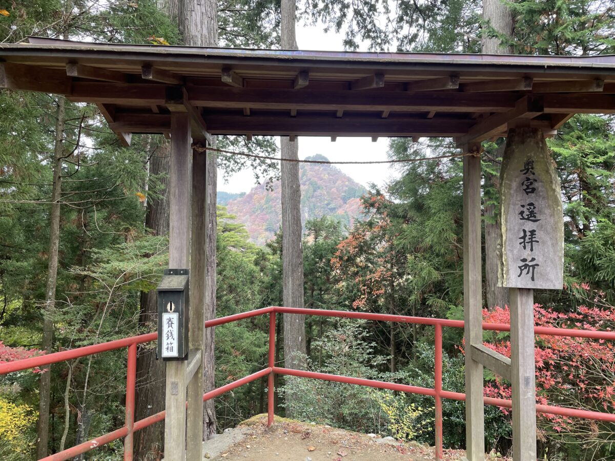 本殿のお参りを済ませたら、裏手にある奥宮遥拝所へ行ってみてください。紅葉した奥宮がとても綺麗ですよ。もちろん奥宮までのハイキングもオススメですが、今回は、長尾平(ながおだいら)を目指します。