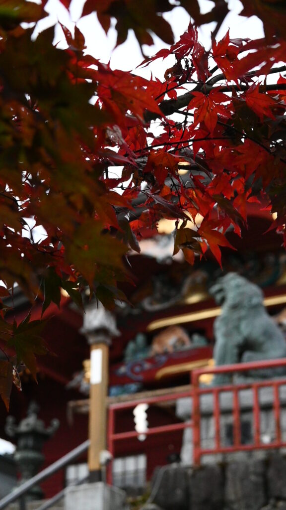 石段を登りきると武蔵御嶽神社に到着です。朱色の本殿ともみじの赤のコラボレーションを写真におさめている方がたくさんいました。