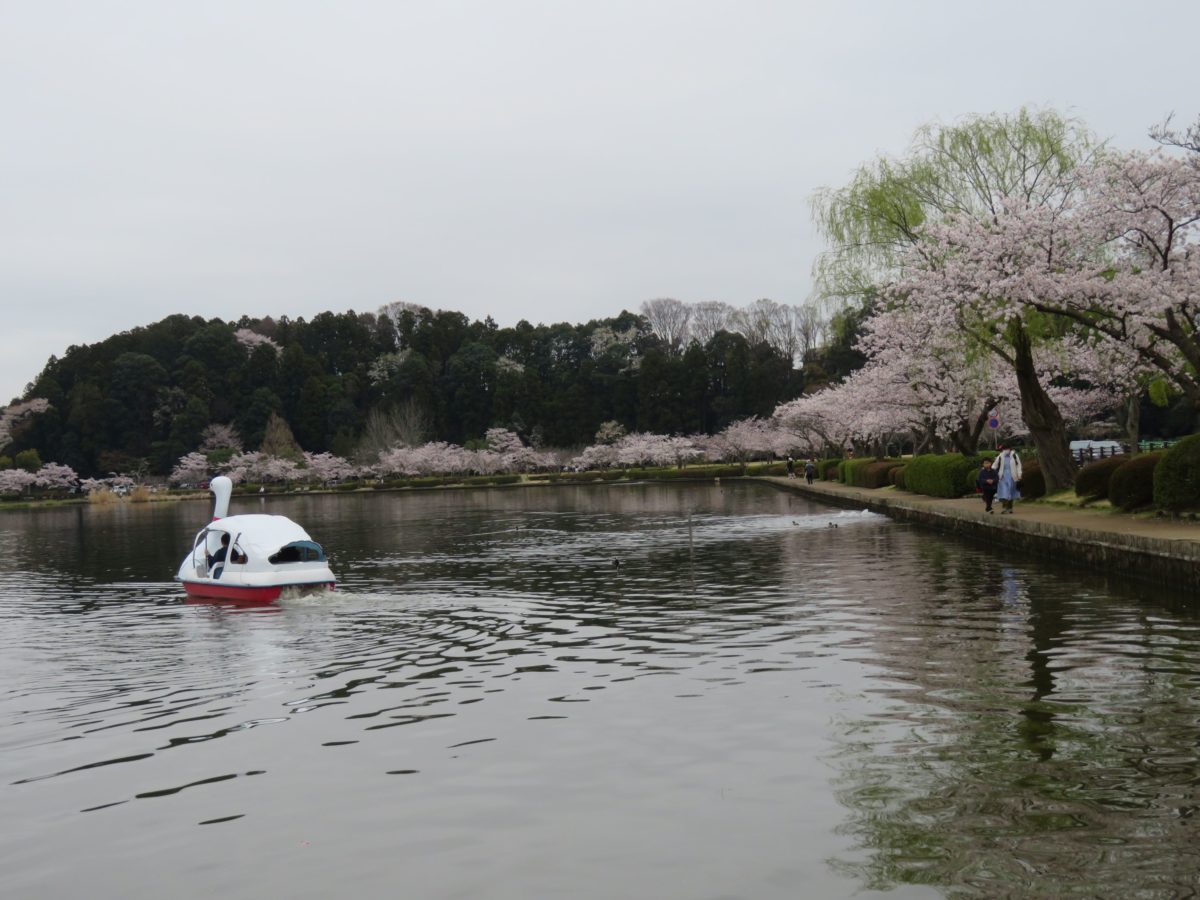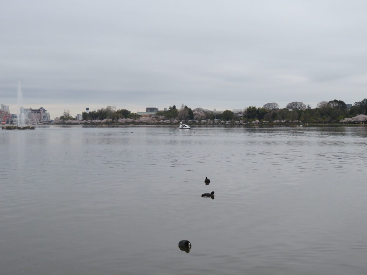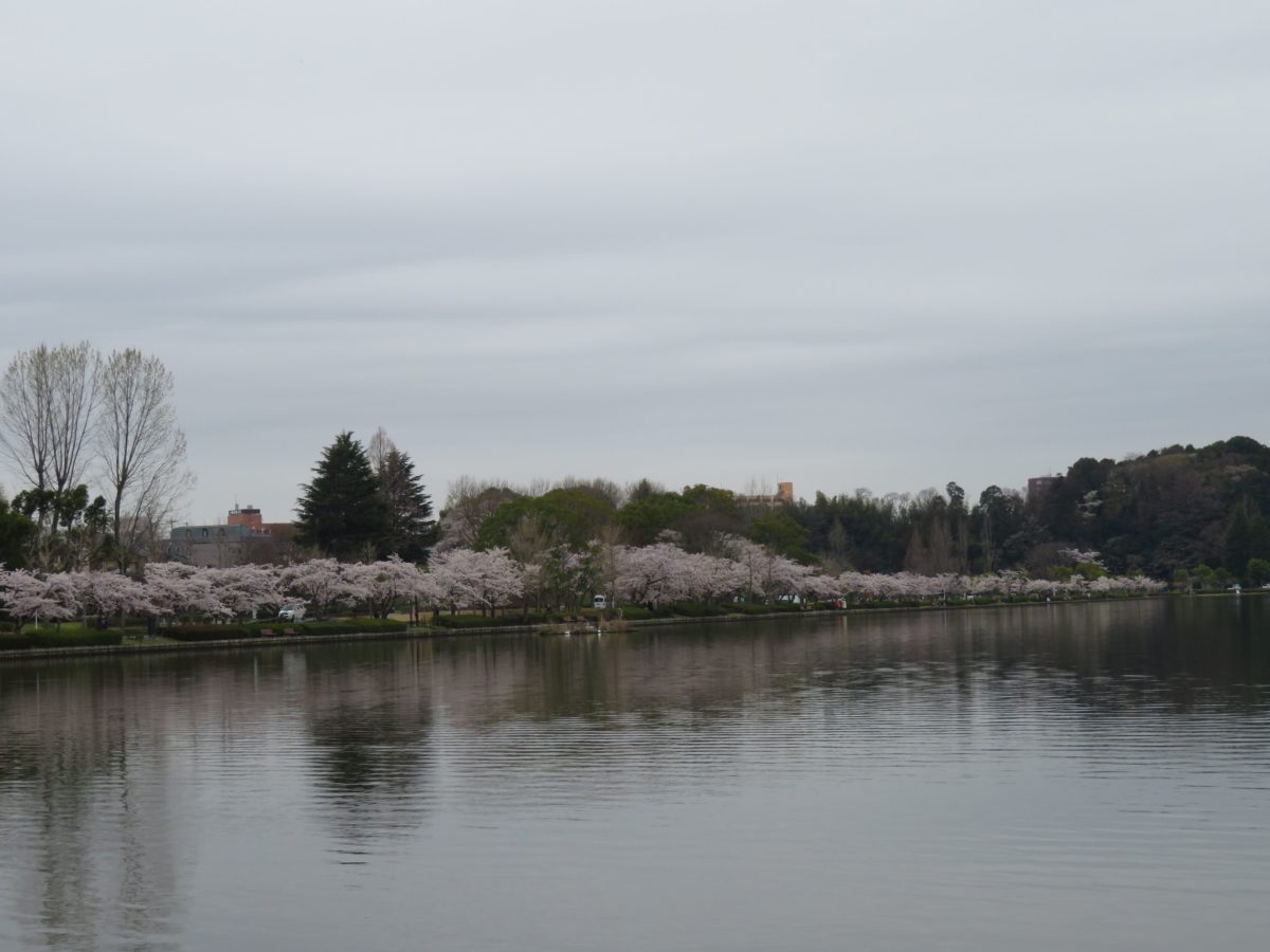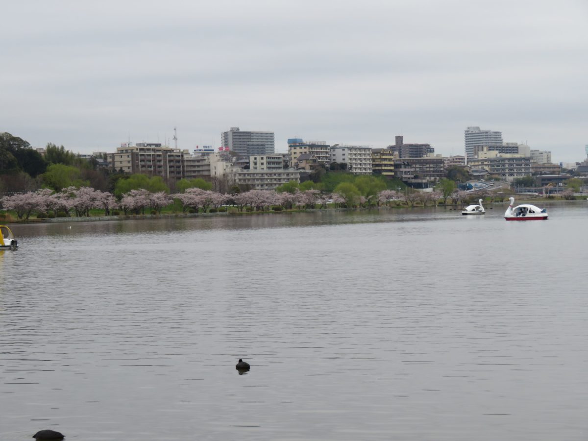 西岸からボートに乗って千波湖に漕ぎ出せば、360度のパノラマで桜に囲まれます。
