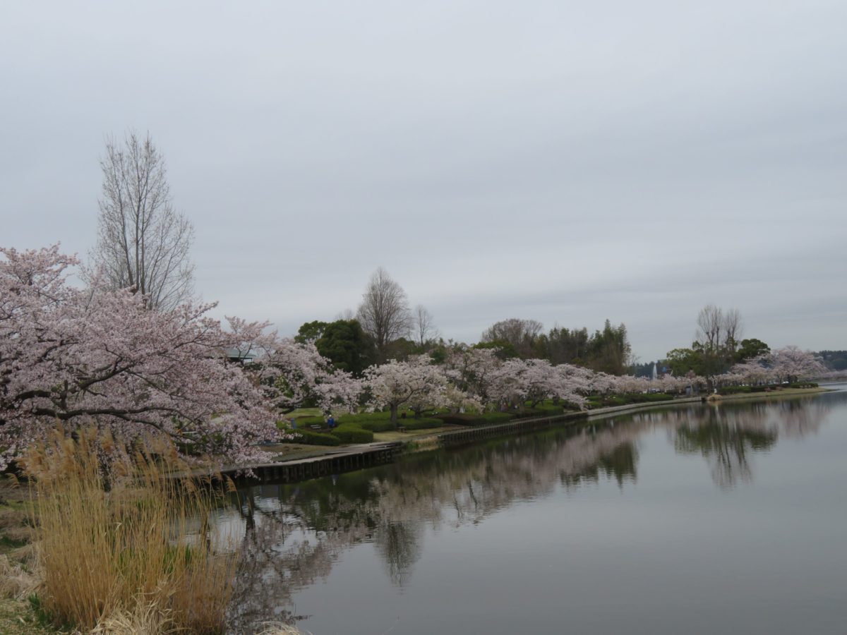 千波湖の西湖畔には親水デッキが設けられているので、ここから周囲を見渡すと湖面から湖を取り囲む桜を眺めているような気分となります。