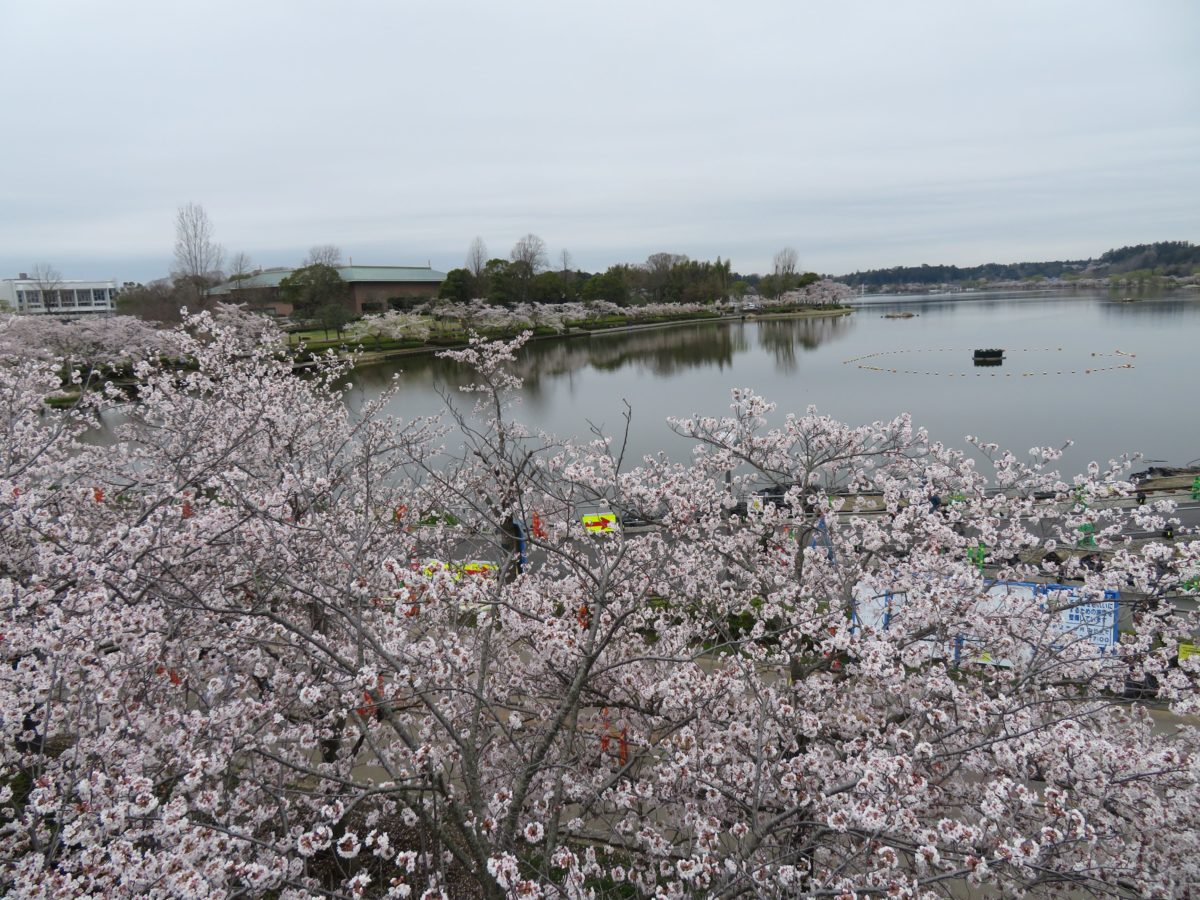 桜の花で彩られる千波湖面