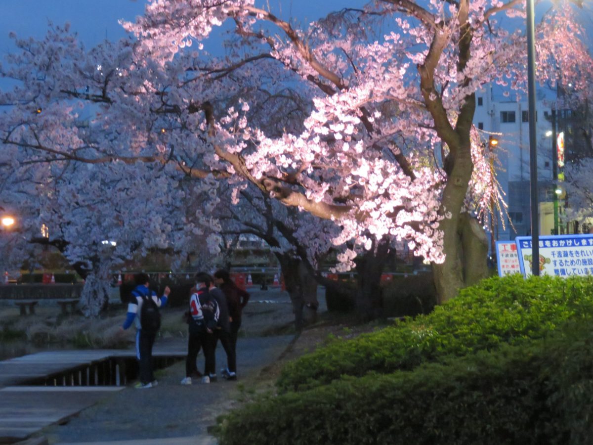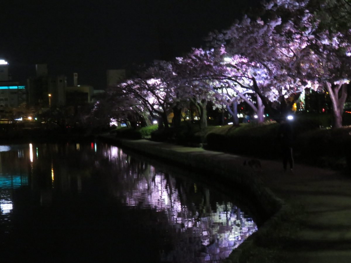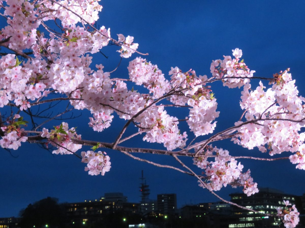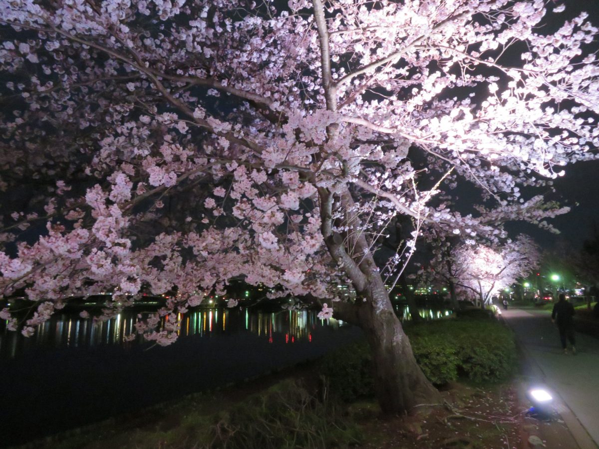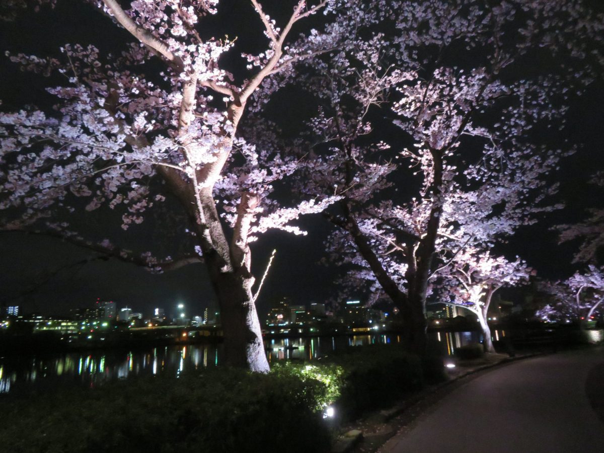 2020年の「水戸の桜まつり」では、様々なイベントが中止となってしまいましたが、夜間のライトアップは予定通り実施されました。18:00に点灯されると、時間とともに変化する残照を背景に桜がファンタジックな色彩を放つかのようです。残光がなくなると、湖面が桜の花で彩られます。