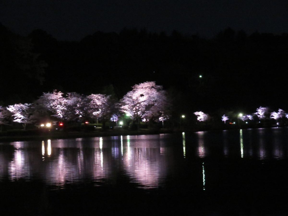 千波湖畔でライトアップされる桜