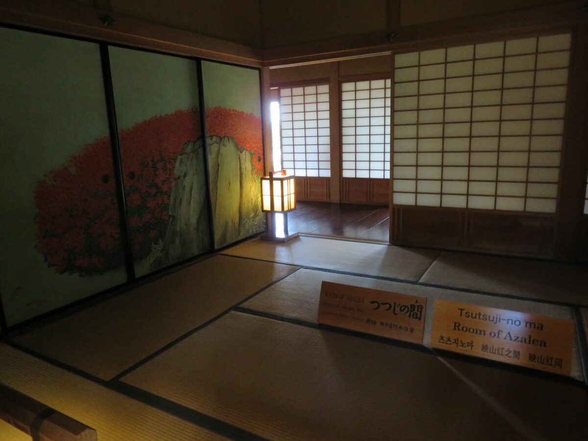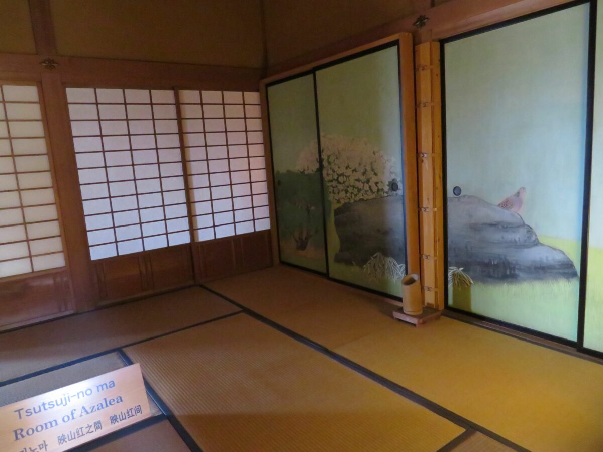 見晴広場の西に接して建つ好文亭が創建されたときには、薩摩藩第11代藩主の島津斉彬が贈ったつつじの巨木で茶室の床柱を作ったと伝わります。現在では奥御殿に「つつじの間」が設けられ、襖絵にはつつじが描かれています。