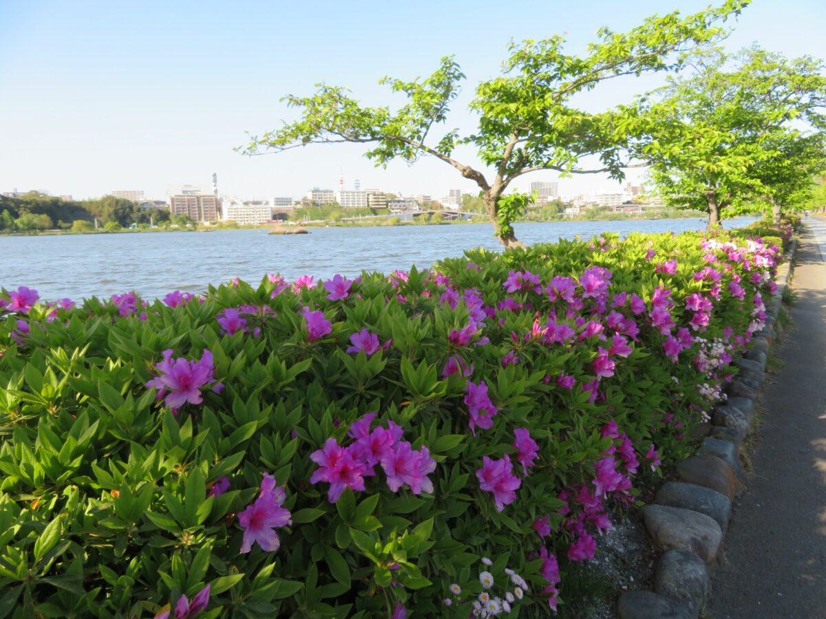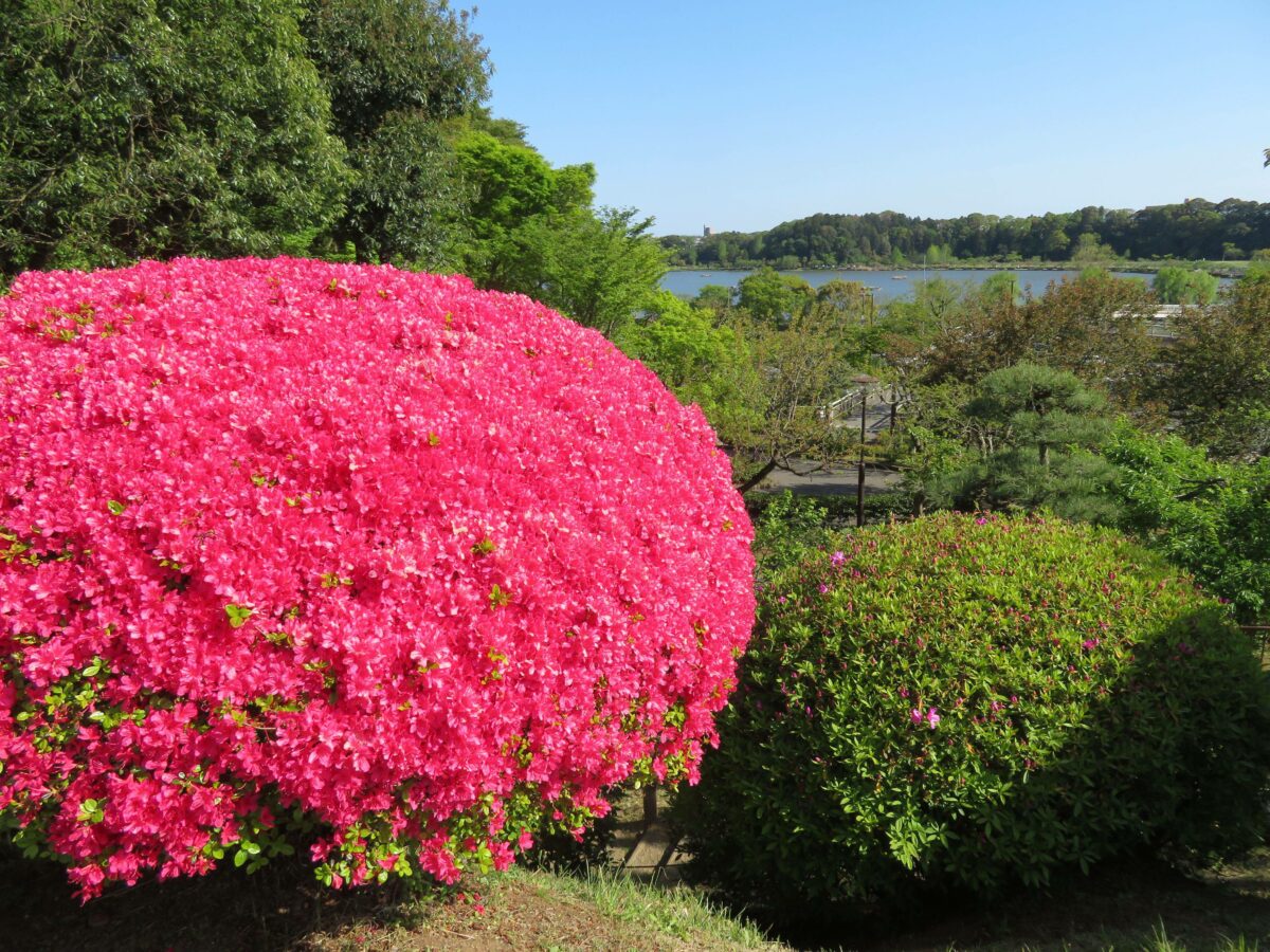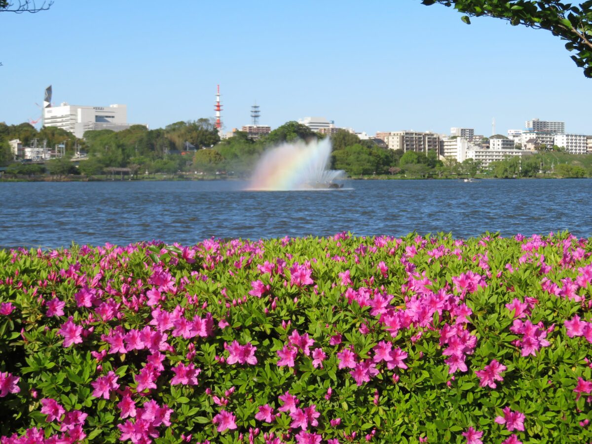 偕楽園の南の千波湖で穏やかな水面を取り囲むのは、つつじの花です。湖を一周する遊歩道からは、つつじの花越しに太陽の光を反射してレインボーカラーに輝く噴水が見え隠れします。
