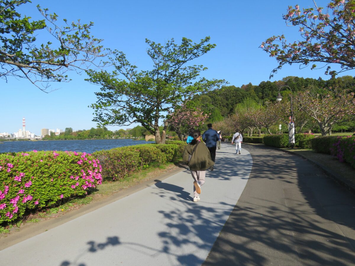 見晴広場の南は千波湖に接しています。湖の水面に向かう斜面は、つつじの花で豊かに彩られます。なだらかな坂道を上り下りしながら、つつじの花を異なる角度から鑑賞することができます。