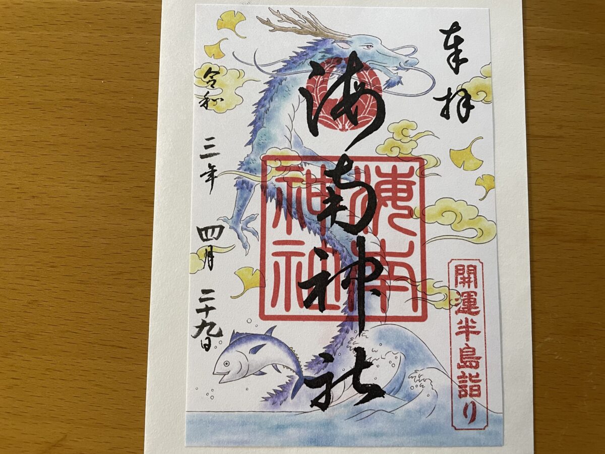 海南神社の限定御朱印と開運守には、マグロと三崎の海に青龍が描かれていました。