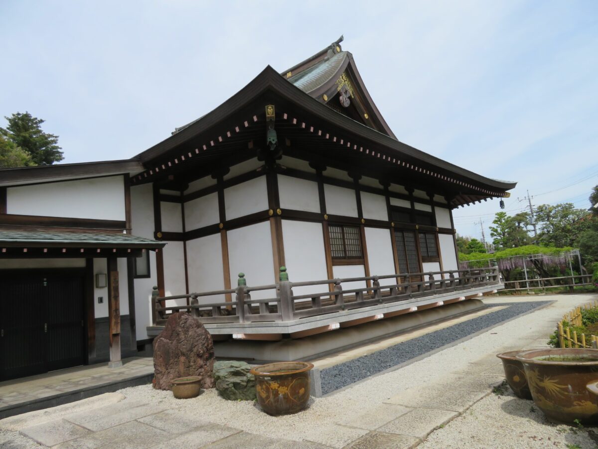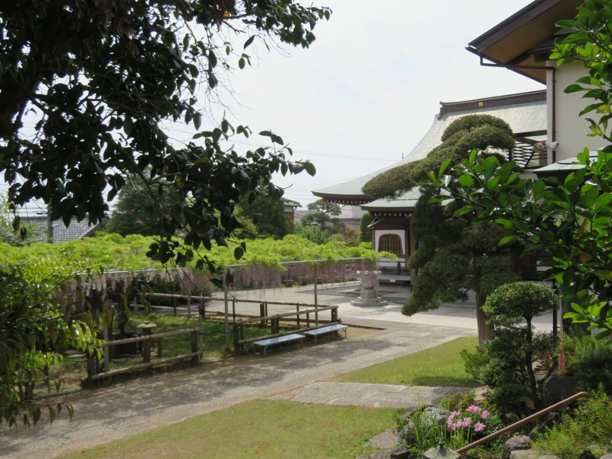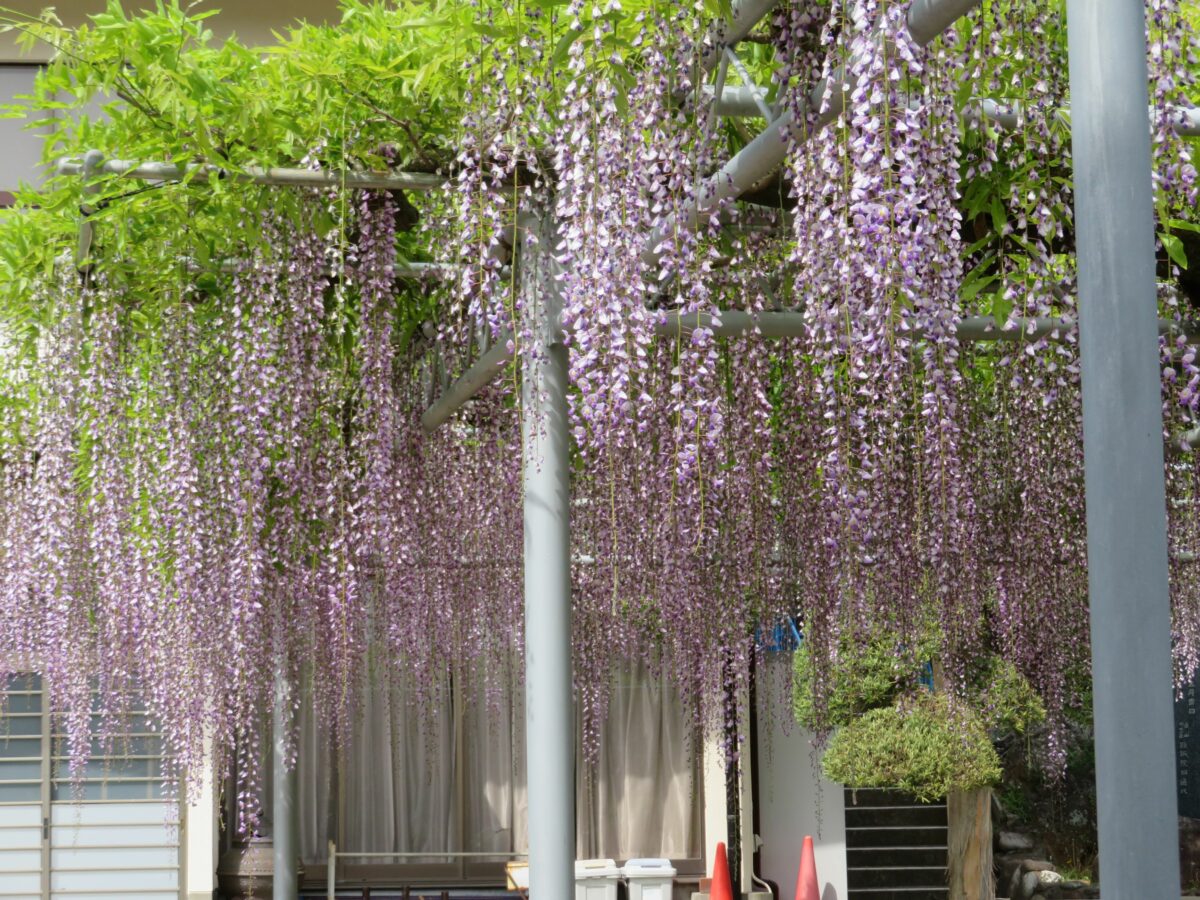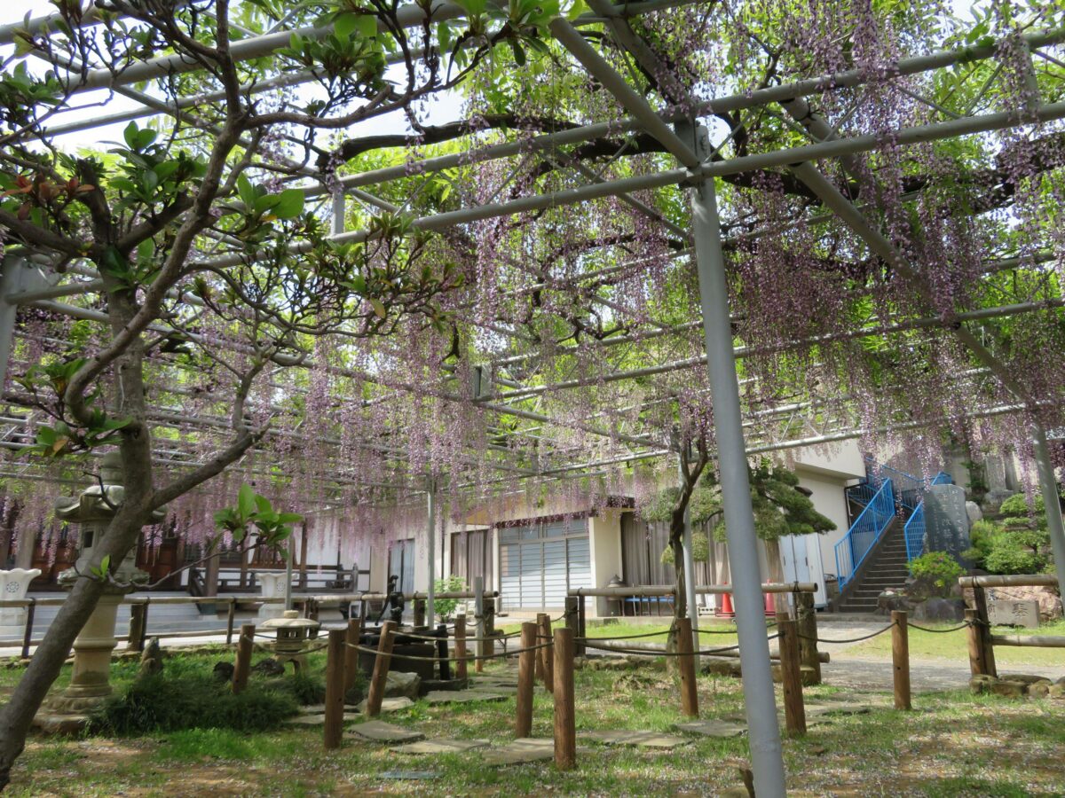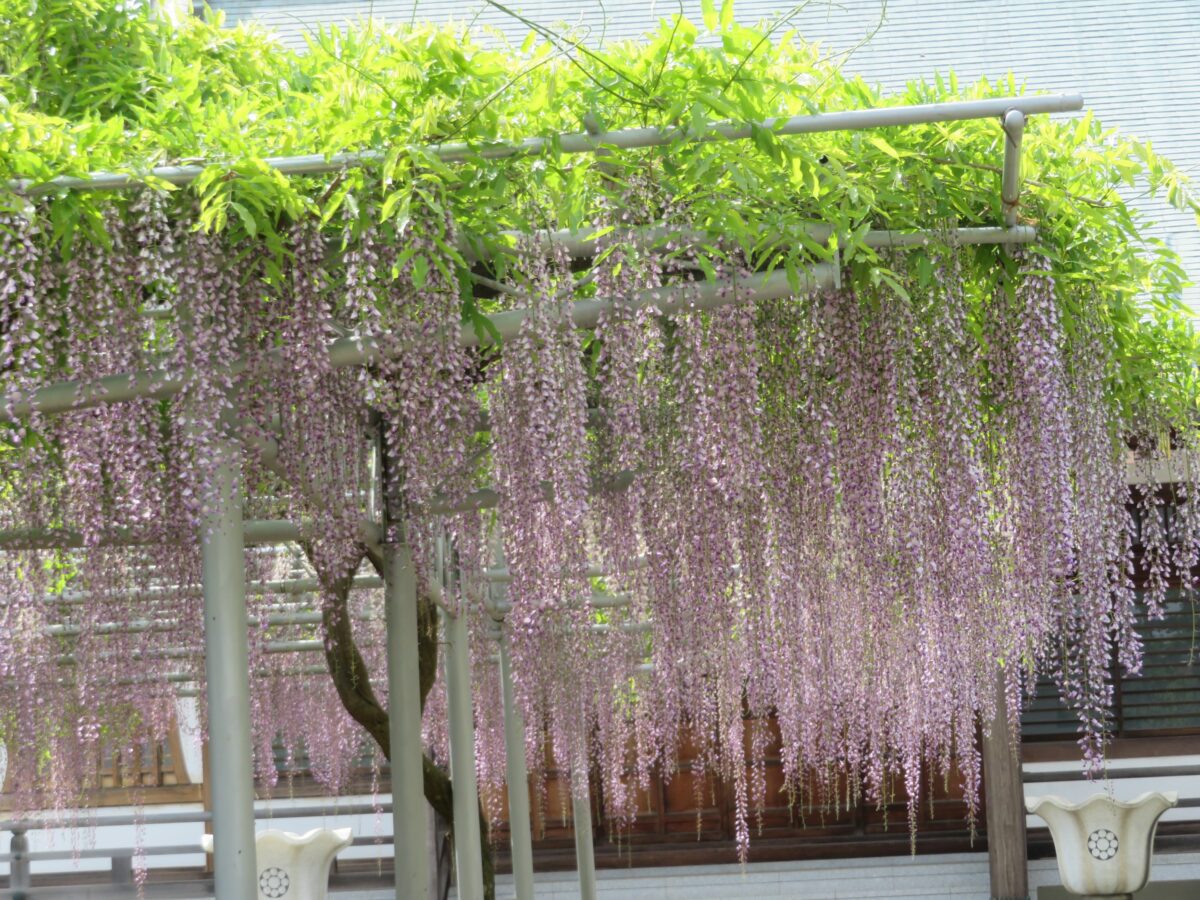 本堂の東の正面に接するように約100平方メートルの藤棚が設置されています。