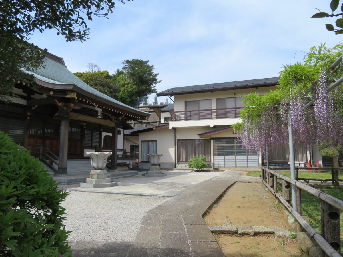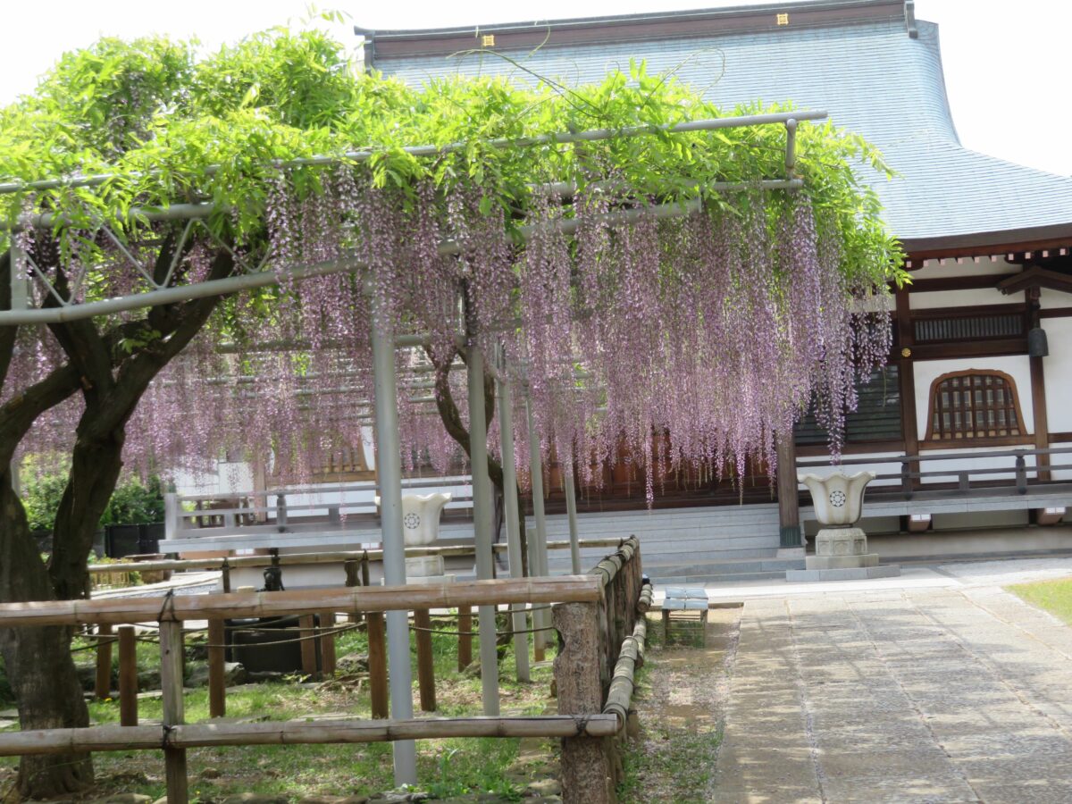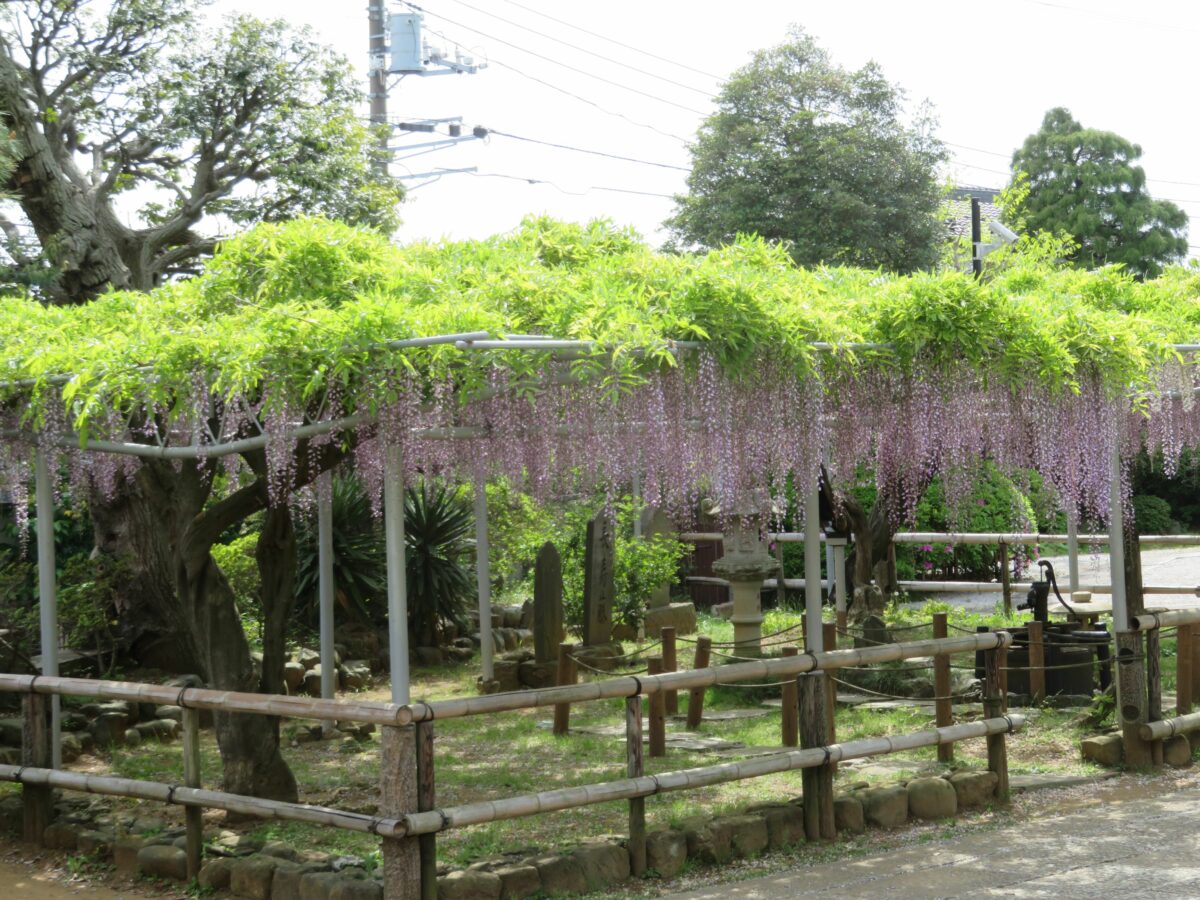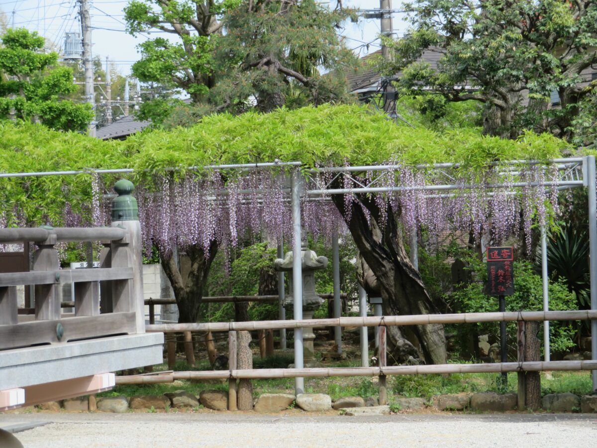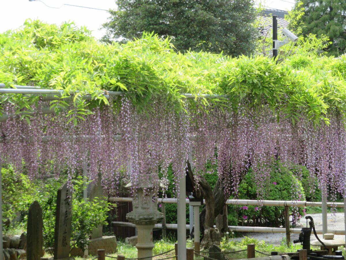 千葉県市川市の宮久保山高圓寺の境内には、推定樹齢200年を超える長寿藤が今も元気に育っています。例年4月下旬から5月上旬には花を咲かせ、1メートルを超え2メートルに迫りそうな長い花序を地面に向かって吊り下げます。