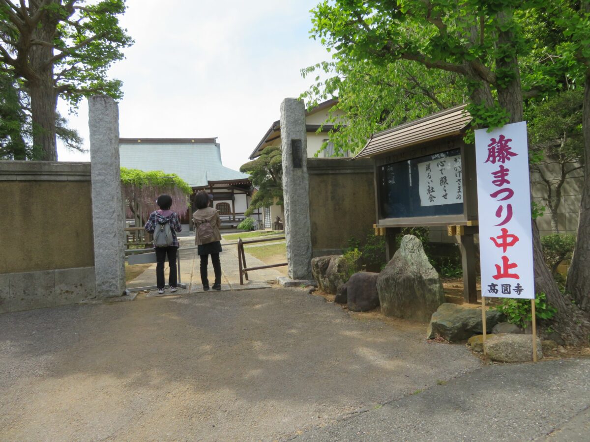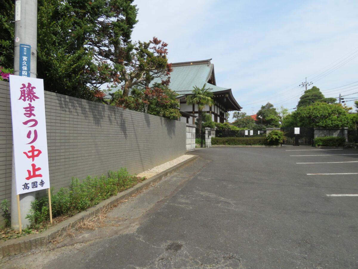 例年、藤の花の見頃時期に合わせて「宮久保山高圓寺藤まつり」が開催されるのですが、2021年は残念ながら中止となりました。露店の出店が控えられるばかりでなく、境内に立ち入ることもできませんでした。訪れた人々は東の正門や、西の駐車場から藤棚を眺めることしかできませんでした。