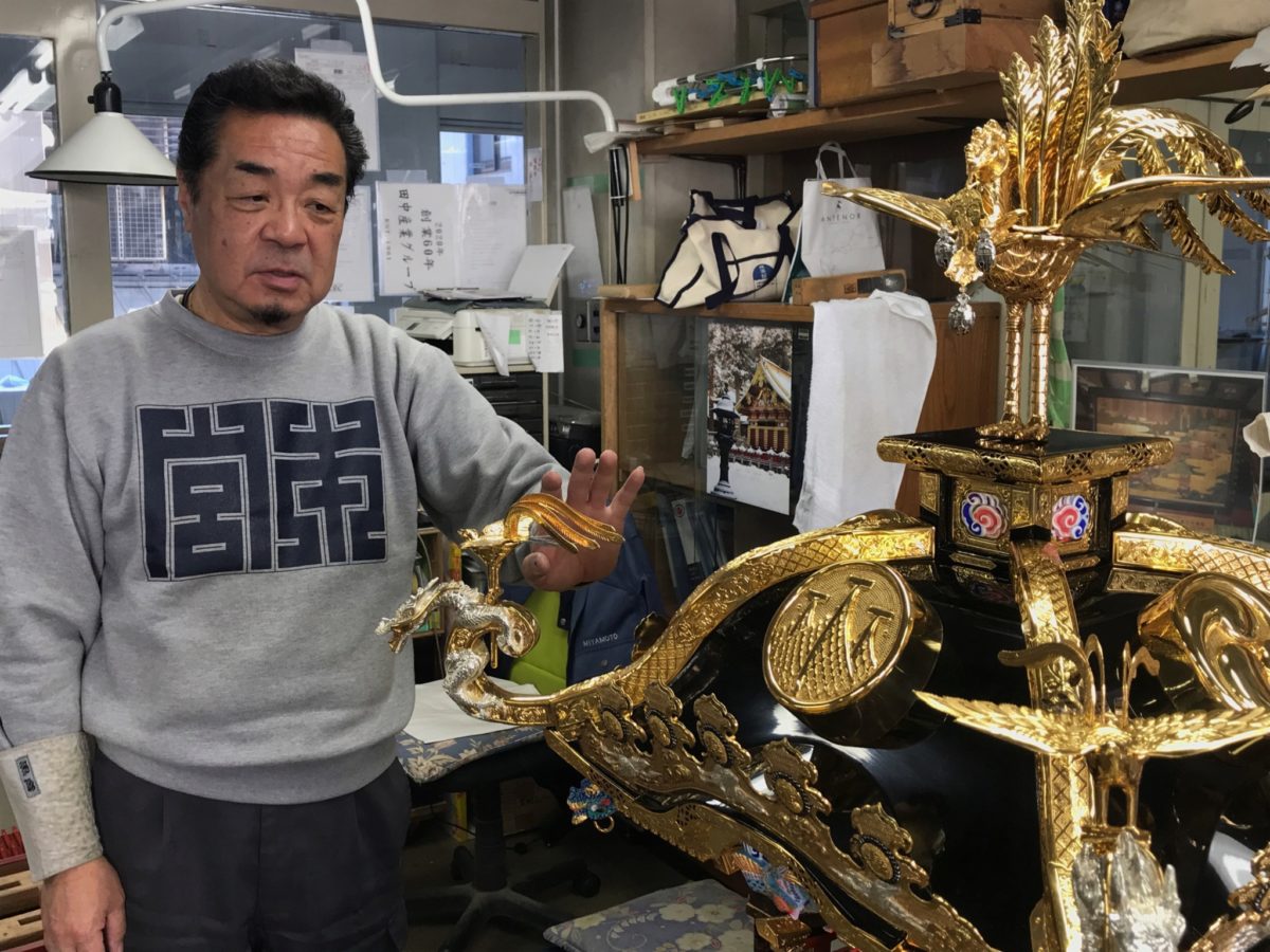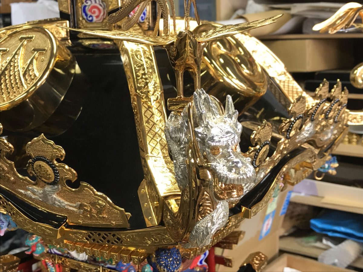 木を彫る人、漆を塗る人、彫金を施す人…等 いくつもの工程を経て一つの神輿・太鼓が製作されています。また、職人全員が太鼓も、神輿も両方を作れる技術を身につけるために、各工程を数年単位で異動して技術を高めていくそうです。