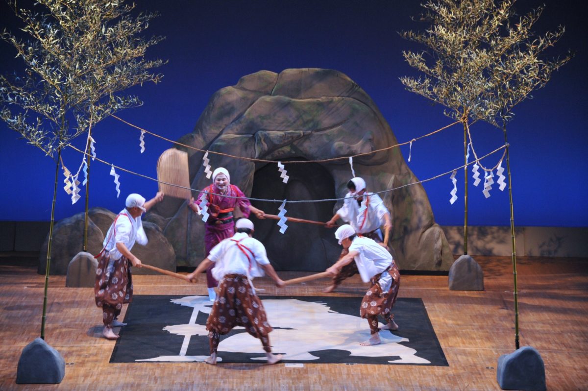『今回の見どころは3つ! 1つめは、5人全員で杵と箕を持ち合って輪になり、箕の下をくぐってまた元の輪に戻るところ、2つ目は、男神と女神で餅を搗いているうちに仲むつまじく激しく絡み合うところ、3つ目は、4人の男神が井桁に組んだ杵の上に餅の入った箕を持った女神が立って、五穀豊穣と子孫繁栄を願い四方八方に餅を撒いてご利益をお裾分けするところです。ヒヤヒヤ、ドキドキの楽しいこの舞を参考にすれば子孫繁栄間違いなし!』