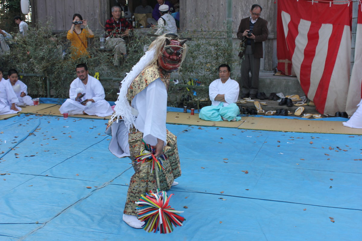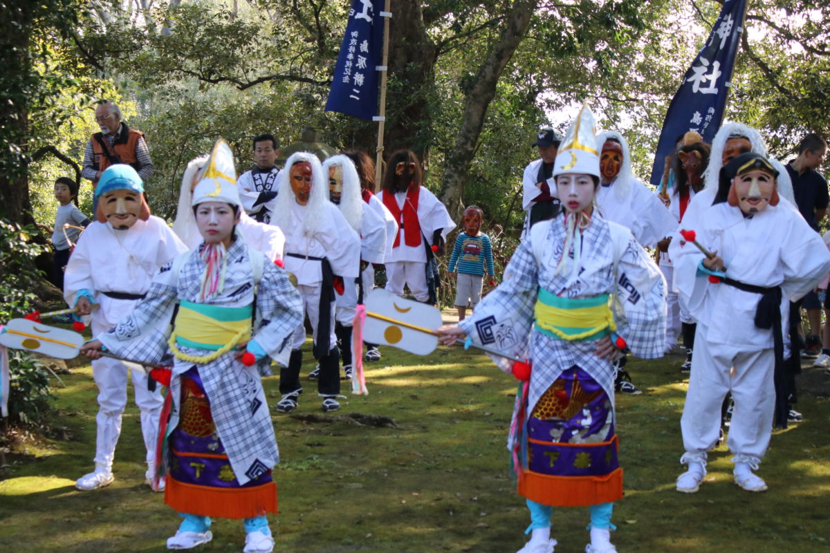 この2カ所の神楽には、嫁女(よめじょ)の舞いに滑稽なちょっかいが出され、笑いを誘います。子孫繁栄、五穀豊穣は祈られ、饌供撒き(せんぐまき)といって大量の餅が撒かれます。太鼓のリズムにも共通性から神楽の伝播に思いをはせることができます。今回の祭りで、リズムの効き比べをしてみてはいかがでしょう。