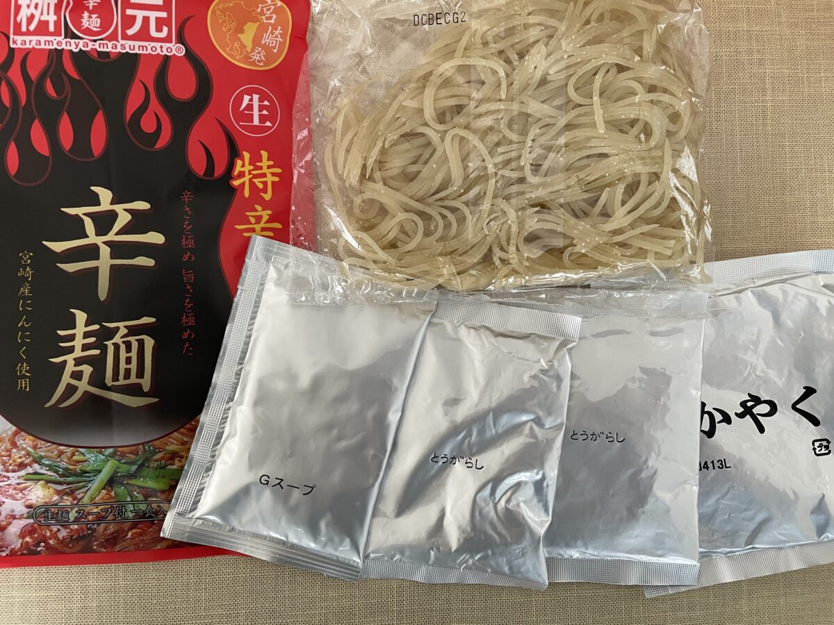 パッケージを開けると、「こんにゃく麵」と呼ばれる生麺、ベーススープ、かやく、辛さの決めてとなる、とうがらしが2袋入っていました。