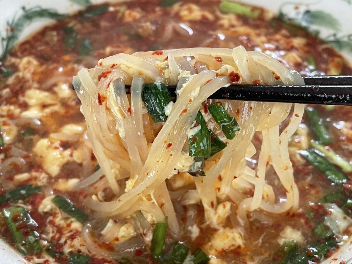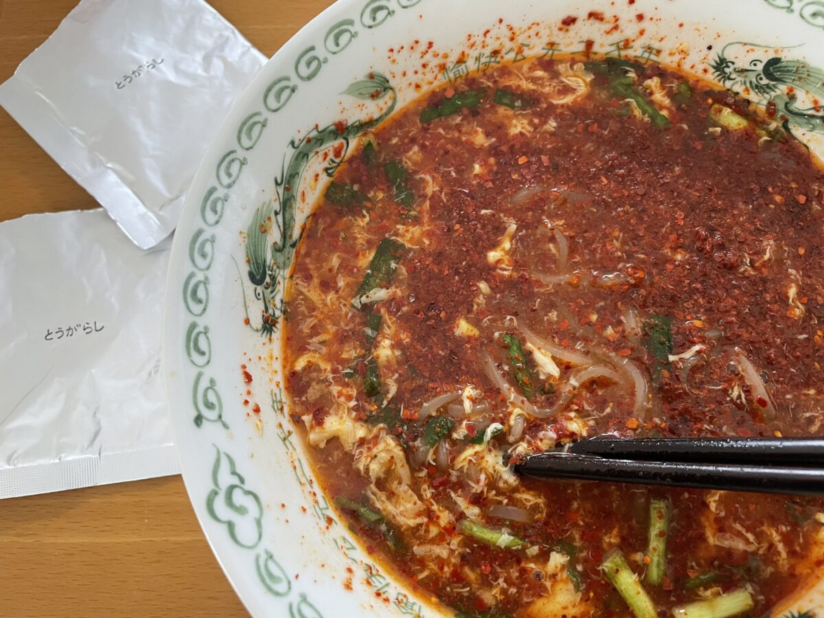 早速実食! そば粉を使用している麺はコシが強く、スーパーは真っ赤でインパクトがありますが、辛さよりも旨味が強い。マイルドな卵の味とひき肉、ニラの風味がとてもマッチして、どんどん箸が進んでしまいました。