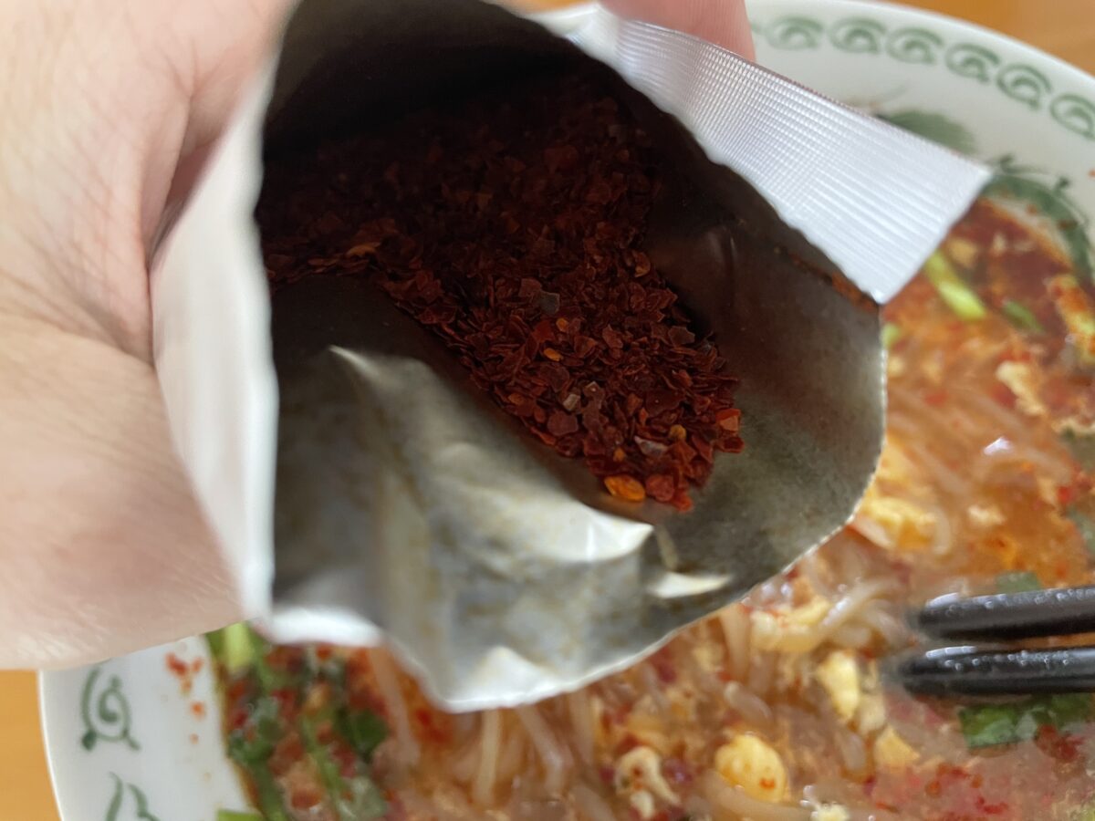 ここから、お好みの量のとうがらしを入れていきます。著者は、辛さがどれくらいなのか心配だったため、まずは一袋だけ入れてみました! とうがらしを入れなければ、辛さが苦手な方や、お子さまでも安心して食べれます。