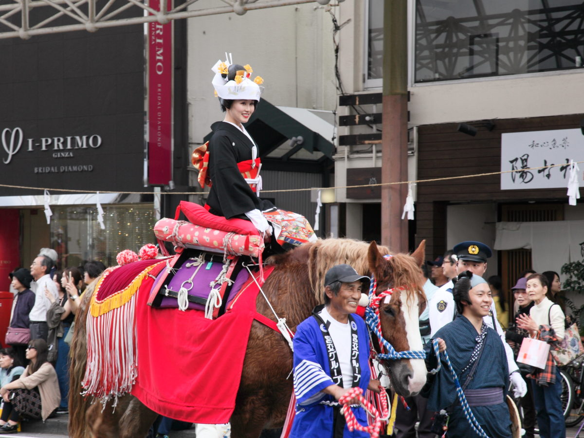 ミスシャンシャン馬は、1949年に「神武さま」に登場して以来、一番人気の模擬新婚夫婦の行列です。これがお目当ての見物客がいるくらいなのです。