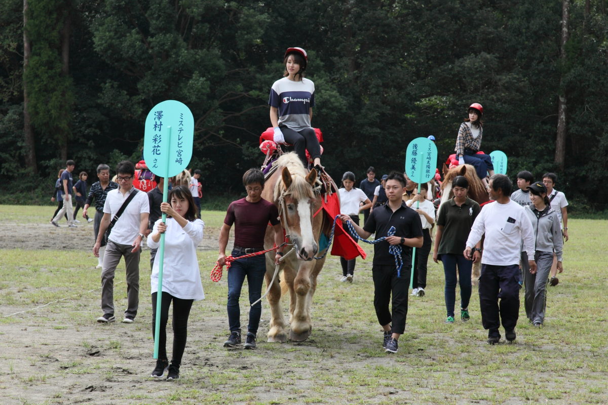 ミスシャンシャン馬は、祭りの拡大と共に乗り手の選出に変遷がありました。花嫁とその馬を引く花婿は、当初、宮崎市内から代表者を選出していました。1951年 からは、宮崎県内各市の代表制となり、1973年からは、宮崎市と周辺の町からの代表制となりました。2000年に公募制にされましたが、翌年からは、協賛企業の社員から選ばれるようになりました。自ら立候補する人がいないわけではないのですが、宮崎には恥ずかしがりやさんが多いのかもしれません。