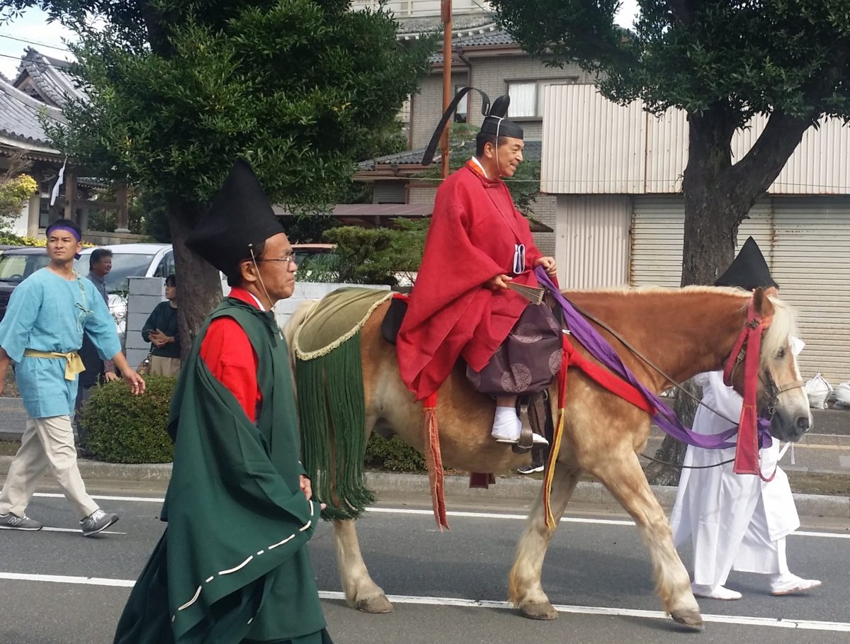 祭り前の準備は、かつら・衣装合わせと乗馬練習の2回だけでした。夫婦のお宮参りの再現をする大役を実感、「緊張した」の一言。
