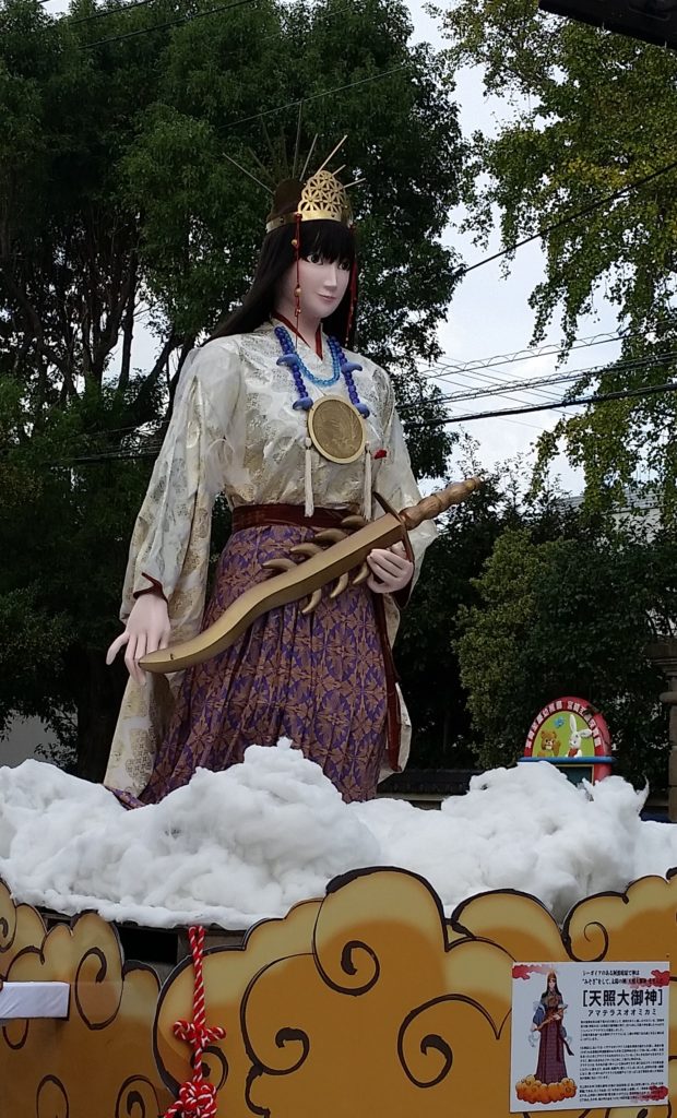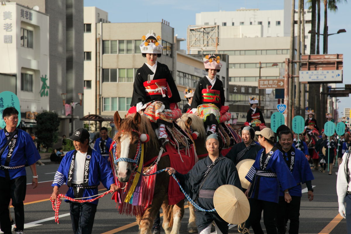 行列後半にはミスシャンシャン馬のほかに、古事記、日本書紀に登場する19神、神武天皇が東征に繰り出したとされる舟「おきよ丸」、などが続きます。祭りのテーマが「神武東遷」でもあるため、宮崎市を含む県内の関係22市町村からも、ミス観光が人力車に乗ったり、各地の民俗芸能集団が大きな交差点で芸能を披露したり、中学高校の吹奏楽部が演奏しながらパレードしたりして、毎年人出が多く、大変華やかな行列となります。また、姉妹都市・奈良県橿原市と有縁交流都市・秋田県大仙市からも参加がありました。