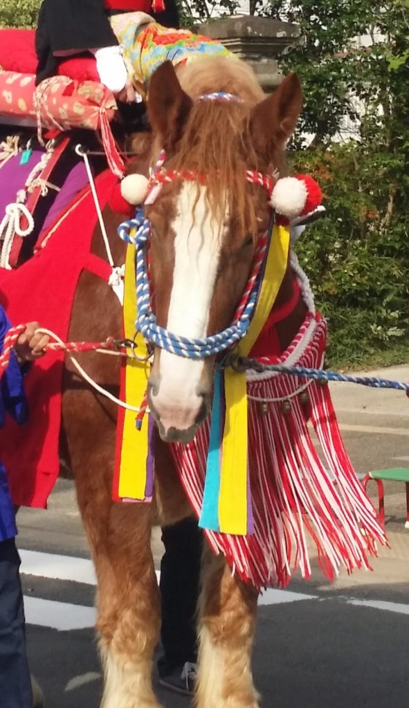 10時から宮崎神宮で本宮祭があり、行列の先頭が出発するのは、13時30分です。シャンシャン馬の出発までは、さらに1時間程度の待ち時間があります。午後からの日差しは強く、水分補給が欠かせないのですが、行列が始まればお手洗いにも行けません。そうするうちに、お馬さんの準備も整いました。
