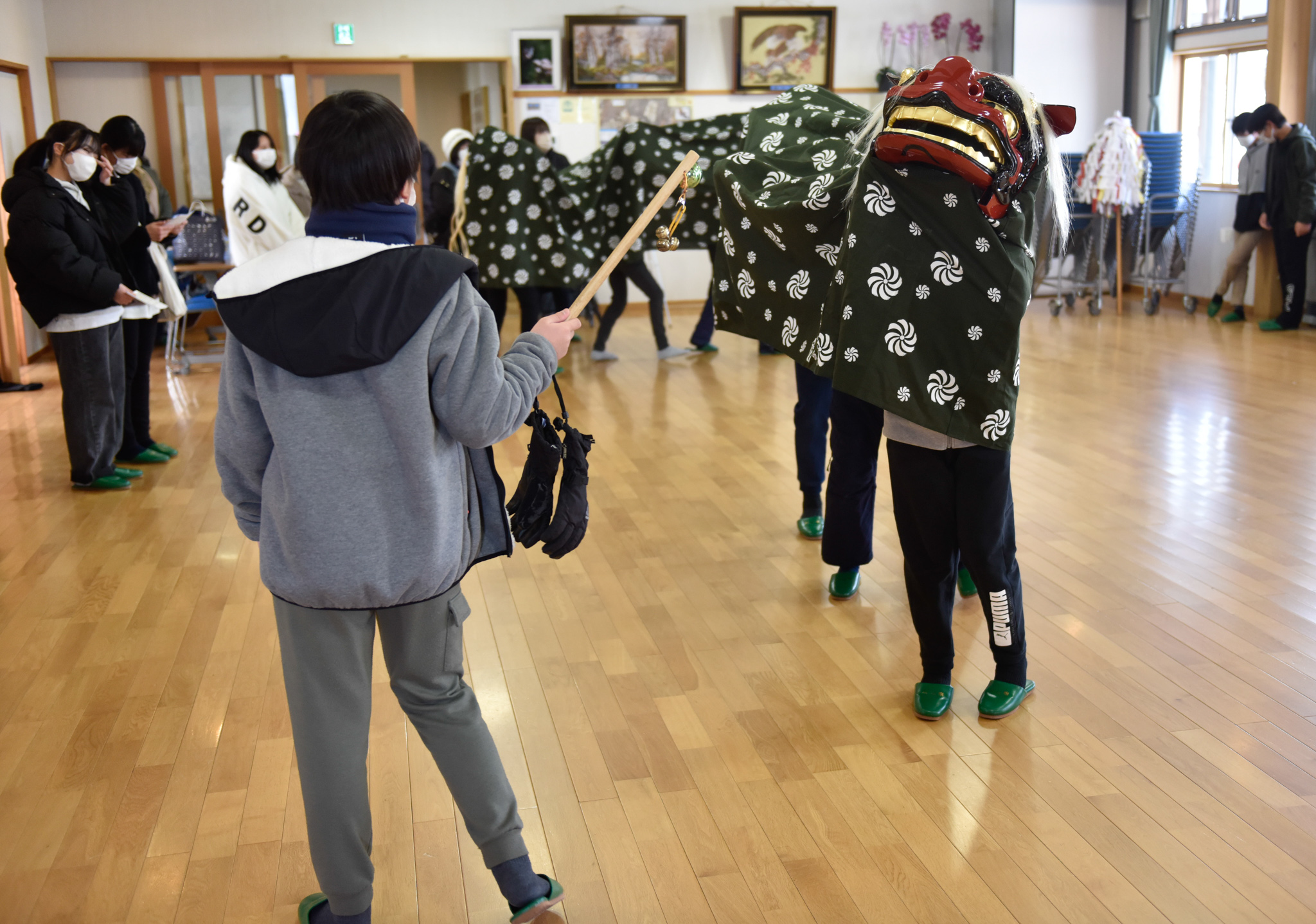 その後に頭噛みや記念撮影が行われ、この一連の流れが4拠点で実施された。また、獅子舞が終わった後はお昼から30分程度、獅子舞の振り返り会が行われて終了となった。