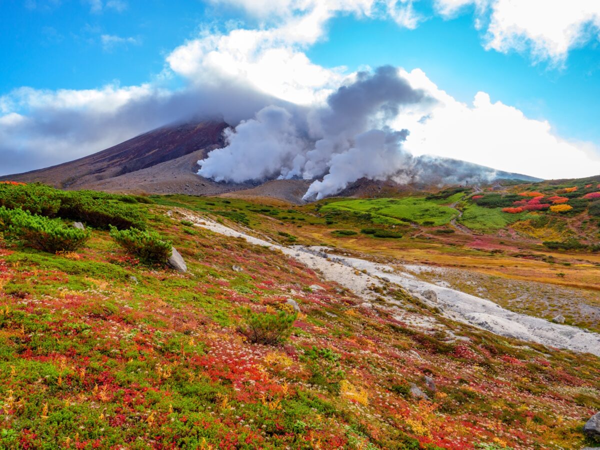 実際に見に行くことができる名所で、日本一早い紅葉が見られるのは、北海道の大雪山旭岳(たいせつざんあさひだけ)といわれています。大雪山は北海道中央部にある火山群の総称。その主峰が標高2,291mの旭岳で、道内の最高峰でもあります。