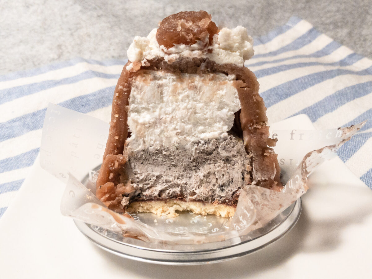 ケーキの内部はクッキー生地を土台に、ナッツのような香ばしくほろ苦いチョコクリームと、ほんのり洋酒が香るホイップクリームの2層構造。チョコクリームに忍ぶクッキークランチが、食感のアクセントとなっているところが面白いですね。エレガントな佇まいですが、様々な味わいを一度に楽しめる遊び心のあるケーキとなっています。