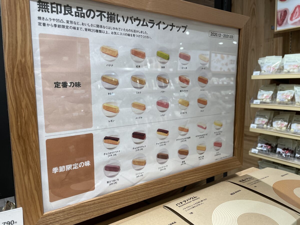 また、人気の不揃いバウムシリーズはラインナップが常時25種類以上あるそうで、店舗には見やすい表もありました。