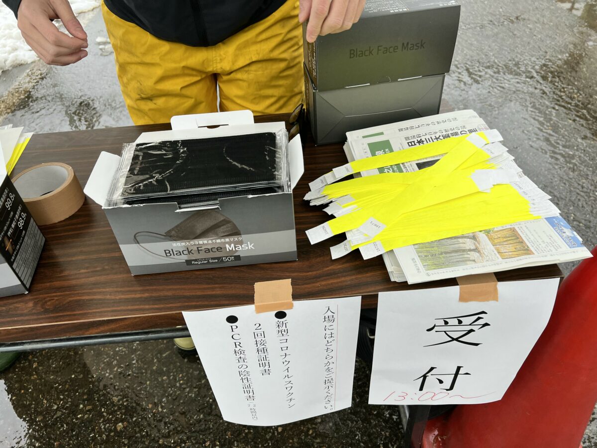 13時になったのでオマツリ会場へと続く関所へ。コロナワクチンの接種証明書アプリを見せて、無事にマスクと腕章をゲット。マスクが黒いのは後ですみ塗りで汚れても大丈夫なようにという配慮らしい。