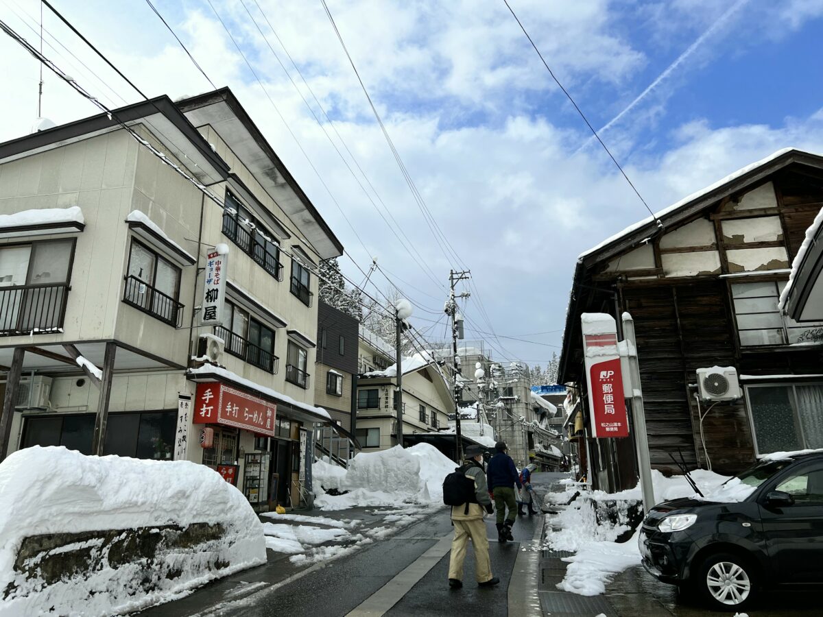 奇祭が行われる、松之山温泉街へ到着。一本道の小さな温泉街といった風情です。