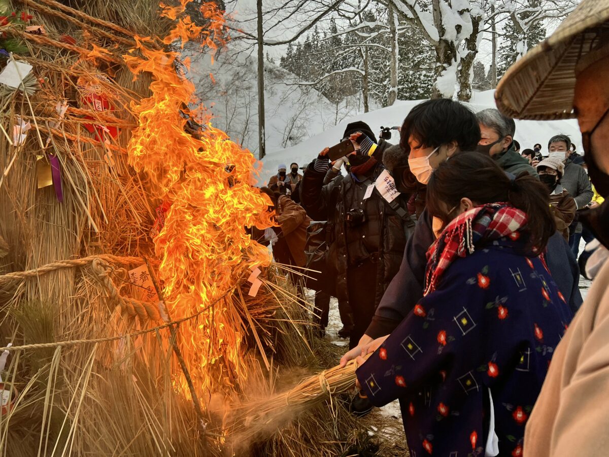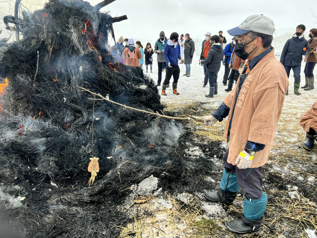 今回最高のシャッターチャンスも無事に終了したので、後半戦の「すみ塗り」会場へと移動しました。どんど焼き用の藁にダルマが磔刑にされたジャンヌ・ダルクのように飾られ、これからまさに火ダルマとなる模様。