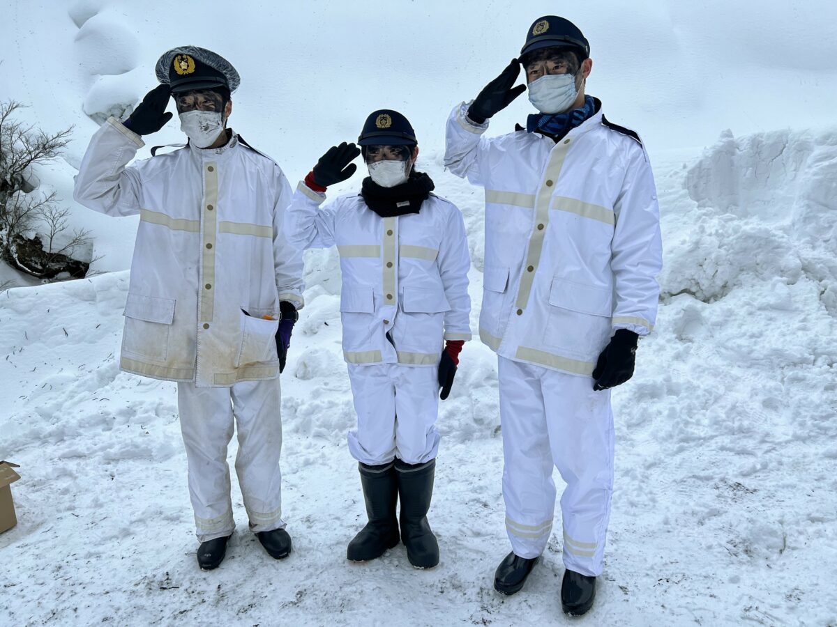 負傷者が出た場合の対応や火の警護にいらした十日町警察署の方々もこの通りまっ黒。