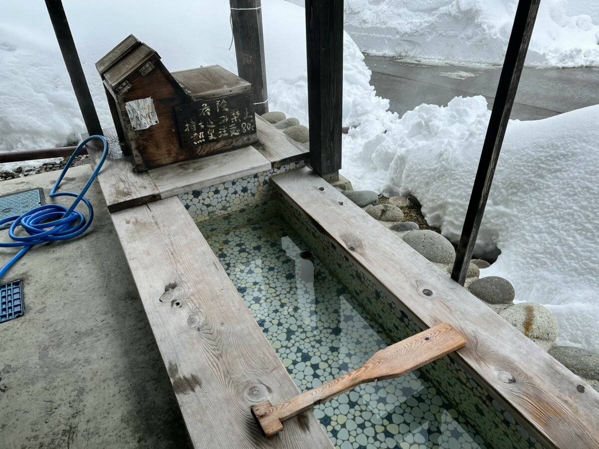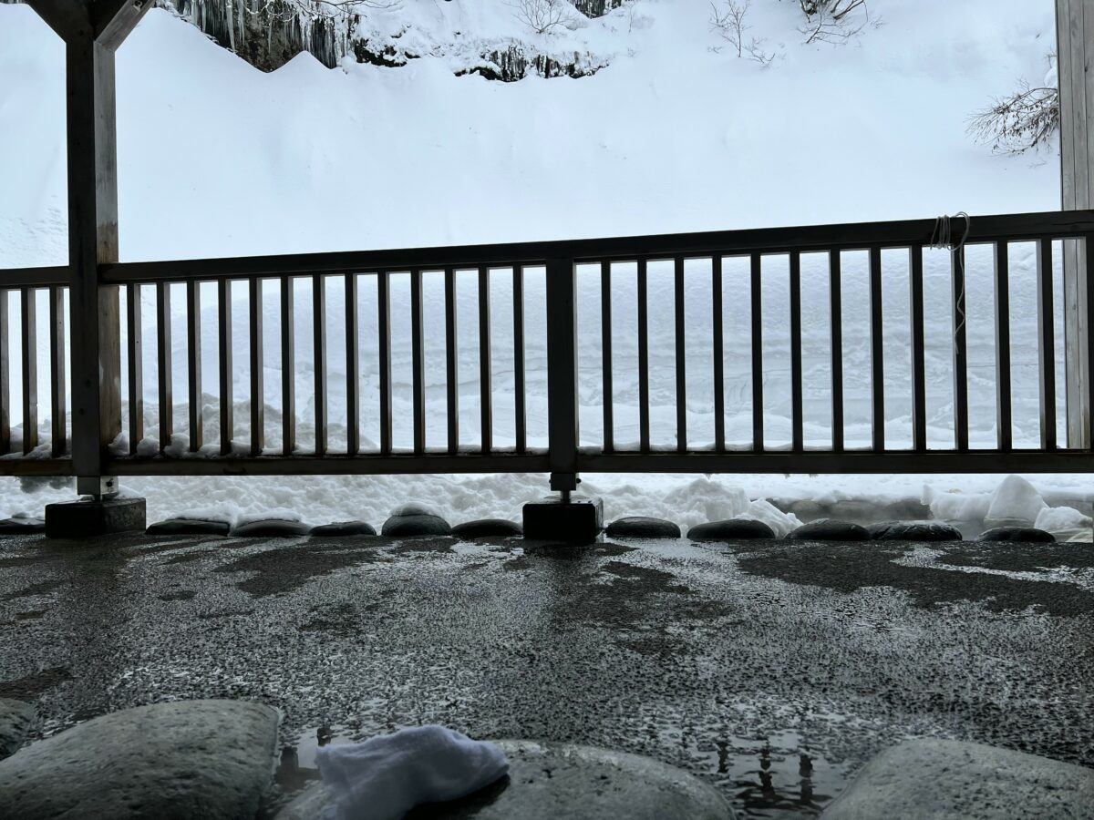 露天風呂から見える一面の銀世界。湯の温度はメチャメチャ熱く、そして何故かしょっぱい!?実はこの温泉、1200万年前の化石海水が基となっているのだそう(まさに秘湯!)。これが日本三大薬湯と言われる由縁か。