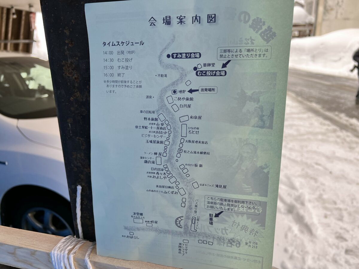 パパパパーン。気さくに話してくれた土産物屋「十一屋商店」さんで奇祭のチラシをゲット。地図によると、松之山温泉は一本道の両脇に宿や店が並び、一番奥のエリアがむこ投げ&すみ塗りの会場となっているらしい。奥のエリアに進むには関所を通る必要があるが、受付は13時~。しばし時間が空いてしまった。