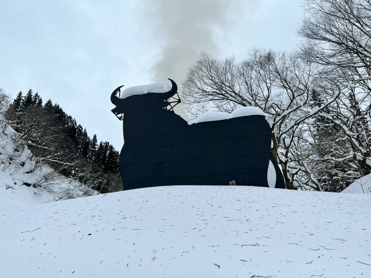 ちなみに、不動滝を上がったところにあるすみ塗り会場にはスペインの作家、サンティアゴ・シエラのアート作品「ブラックシンボル」を設置。この高さ10mの巨大な雄牛は、スペインのシェリー酒製造会社「オズボーン・グループ」の広告看板を引用したポップアートなのだとか。モクモク煙も出ているし、どちらかといえば焼肉屋を彷彿とさせるなと思ったのは、ここだけの話。