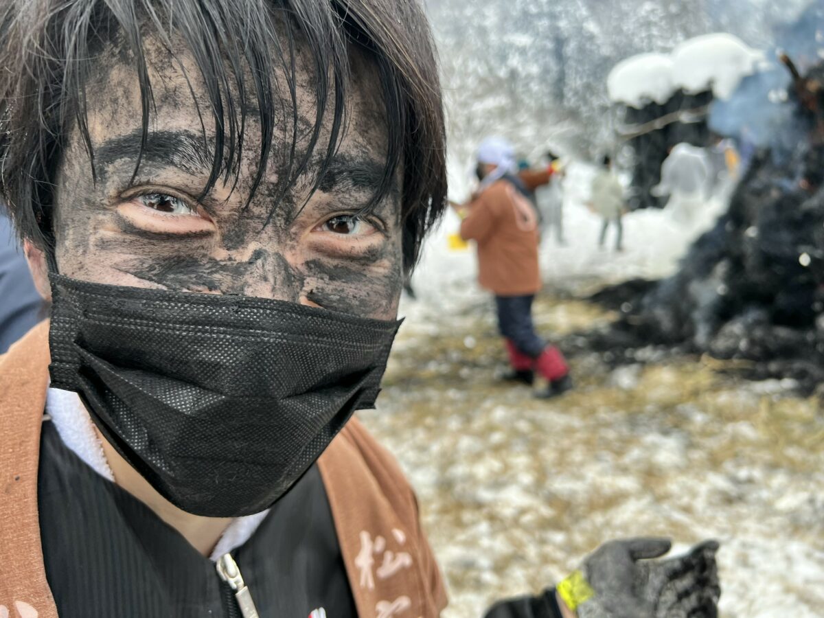 あちらこちらで、子どもたちの楽しげな悲鳴があがり始めました(今度は本当)。笑顔で顔にすみを塗り合い、和やかに新年の挨拶を交わしている年配の方もいます。塗られれば塗られるほど除災祈願となるので、盛大に塗り合いましょう。