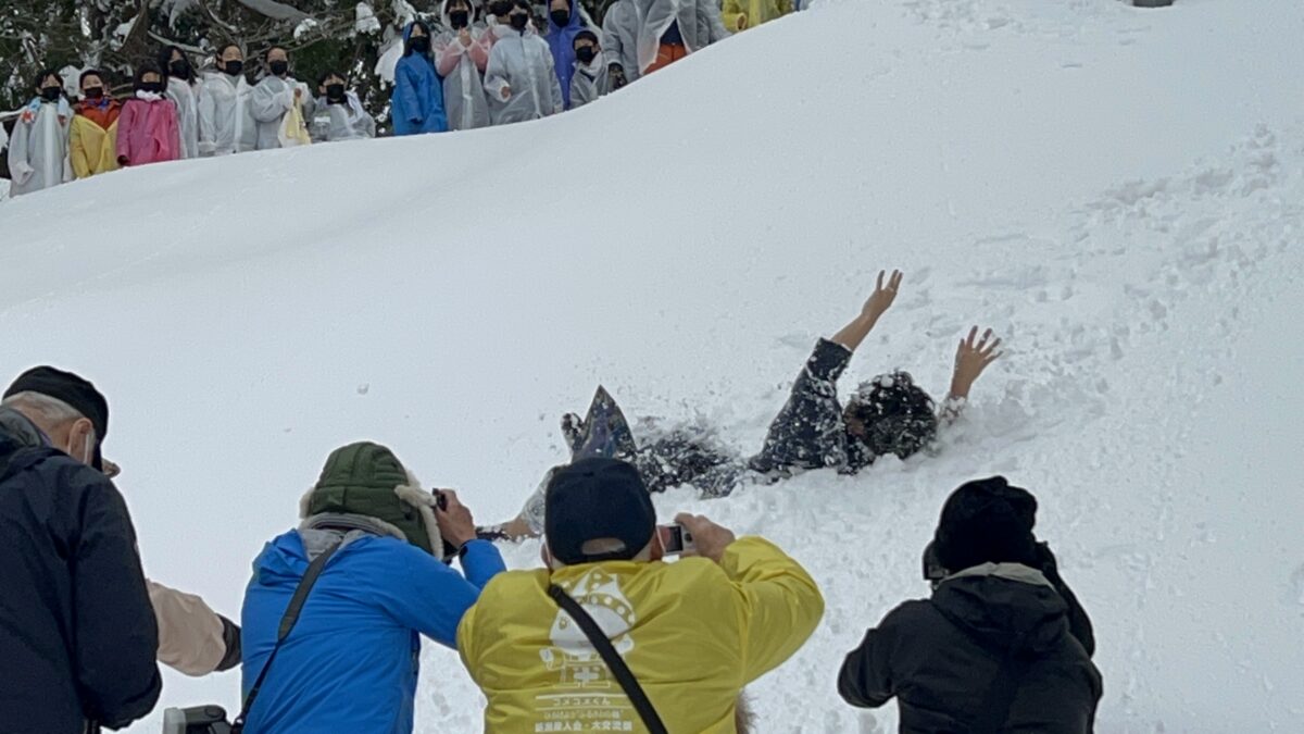 雪の中にぶっ刺さった後、自ら転がるパフォーマンスを見せるムコ様の姿はまるでリアクション芸人のよう。